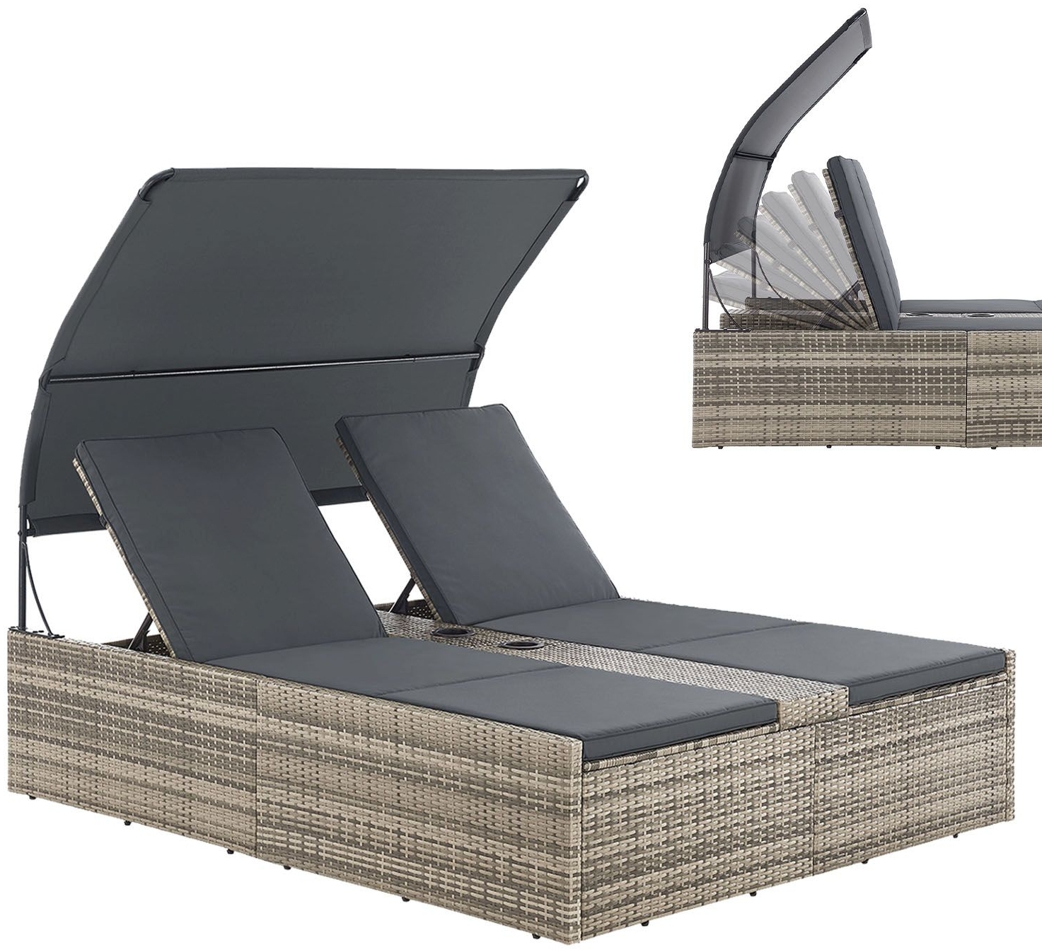 | Name | Juskys Polyrattan Doppelliege Syros - Garten Sonnenliege für 2 Personen - Outdoor Liege mit Dach & Auflagen - Kopfteil verstellbar - Grau-meliert |