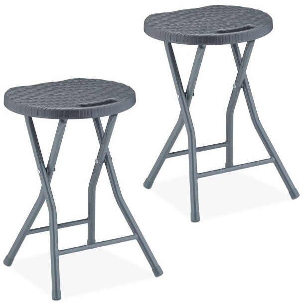 Praktisches Rattan Klapphocker 2er Set für Garten, Balkon oder Terrasse. Die Hocker in grauer Rattan-Optik bieten eine flexible Sitzgelegenheit und sind bei Nichtgebrauch platzsparend zusammenklappbar. Mit einer Traglast von je ca. 120 kg und einem Gewicht von nur ca. 1,6 kg sind sie leicht zu transportieren und robust. **Highlights** - Robuste Klapp-Sitzhocker im praktischen 2er Set - Modernes Design in grauer Rattan-Optik - Stabil mit Metallbeinen und Sitzfläche aus Kunststoff - Platzsparend klappbar - Mit Tragegriff zum Transport **Produkteigenschaften** - Größe H x B x T: ca. 46 x 32 x 29 cm - Geklappt H x B x T: ca. 70,5 x 32 x 7,5 cm - Traglast: je ca. 120 kg - Gewicht: je ca. 1,6 kg - Material: Kunststoff, Stahl - Farbe: Grau **Lieferumfang** - 2x Rattan-Hocker - Dekoartikel sind nicht im Lieferumfang enthalten