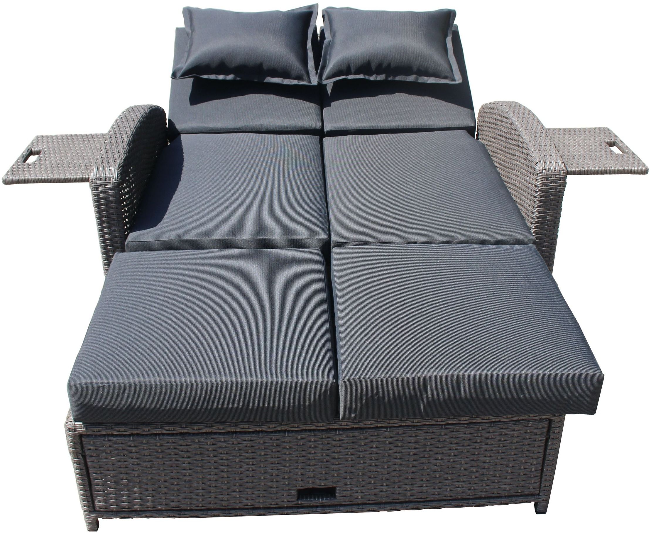 ## Outdoor Funktionssofa NIZZA mit Liegefunktion und Klapptischen das Gartensofa NIZZA mit Liegefunktion ist ein echter Allrounder, man kann mit dem Sofa am Gartentisch zum Essen sitzen, durch die 5-fach verstellbare Rückenlehne kann auch eine bequemere Position für ein Glas Wein eingenommen werden, oder man kann sich gleich in die Liegeposition zum Sonnen oder für ein Nickerchen begeben. Das verwendete, hochwertige und besonders wetterfeste Geflecht wird in handwerklicher Tradition verarbeitet und verleiht den fertigen Möbeln enorme Festigkeit sowie höchsten Sitzkomfort. Das Geflecht ist optimal für die Nutzung im In- sowie Outdoorbereich geeignet. Die Sitzfläche ohne Auflage ist ca. 35 cm hoch. Sitz- und Rücken mit der Auflagenhöhe von 6-7 cm kommen hinzu, da ergibt Gesamthöhe etwa 42 cm. Einschiebbares Fußteil ist ohne Auflage 30 cm hoch. Es kommt noch die Auflagenhöhe von 10 cm hinzu, das ergibt eine Gesamthöhe etwa 40 cm (Es gibt also einen kleinen Absatz zwischen Fußteil und Sitzfläche). * **B/H/T 117 x 93 x 74 cm** * **Sitzhöhe 42 cm inkl. Polster** * **Sitztiefe ca. 58 cm** * **Breite der Sitz oder Liegefläche 100 cm** * **Länge der Liegefläche mit Hocker 185 cm** * **Für 2 Personen geeignet** * **Rückenlehne 5-fach verstellbar** * **Stahlgestell, galvanisiert, pulverbeschichtet** * **Doppelt-Halbrundes Kunststoffgeflecht** * **Mit ausklappbaren Seitentischen 33 x 28 cm** * **Der Hocker ist in das Sofa einschiebbar** * **Mit Sitz-, Rücken- und Kopfkissen** * **Auflagen mit Reißverschluss** * **Stoff 100% Polyester** * **Belastbar bis 120 kg je Sitz** * **Lieferung fertig montiert**
