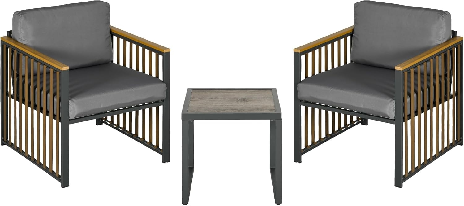 Das Outsunny Gartenlounge-Set ist eine stilvolle 3-teilige Gartengarnitur, die aus zwei Stühlen und einem Beistelltisch besteht. Hergestellt aus einem stabilen Metallrahmen, umhüllt von wetterbeständigem PE-Rattan, bietet es sowohl Komfort als auch Langlebigkeit. Die 10 cm dicken Sitzkissen sorgen für zusätzlichen Sitzkomfort, während die Holzoptik des Tisches eine natürliche Note verleiht. Ideal für Terrasse und Garten. **Highlights** - Wetterbeständiges PE-Rattan für dauerhafte Nutzung - 10 cm dicke gepolsterte Kissen für hohen Komfort - Holzoptik-Kunststoffplatte am Tisch für ansprechendes Design - Verstellbare Füße am Tisch für Stabilität - Rutschfeste Füße an den Stühlen für sicheren Stand **Produkteigenschaften** - Farbe: Grau, Braun, Teak - Material: Stahl, Aluminium, PE-Rattan, Kunststoff, Polyester - Sesselabmessung: 66 x 68 x 68 cm - Tischabmessung: 45 x 45 x 44 cm - Sitzgröße: 58x58 cm - Sitzhöhe: 36 cm - Maximale Belastung: 30 kg (Teetisch), 120 kg (jeder Stuhl) **Lieferumfang** - 2 x Sessel - 1 x Couchtisch - 1 x Anleitung