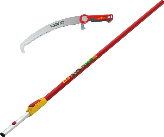 Teleskopierbarer Stiel erreicht Höhen bis 5,50 m und bietet durch gebogenes Sägeblatt saubere Schnitte.