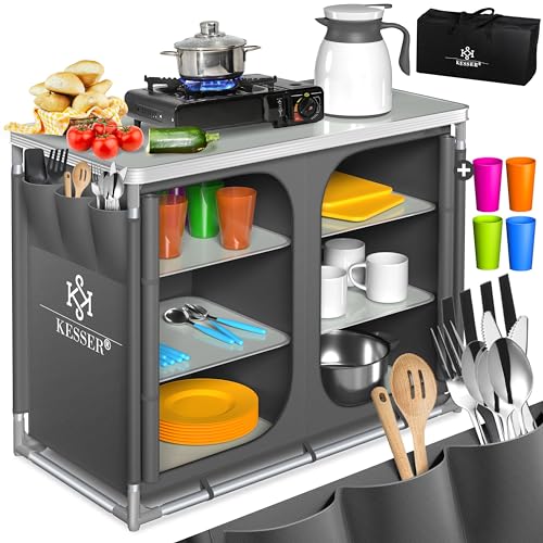 "Bietet durch zahlreiche Ablageflächen und schnellen Aufbau eine platzsparende und organisierte Küchenlösung für Camping und Outdoor."