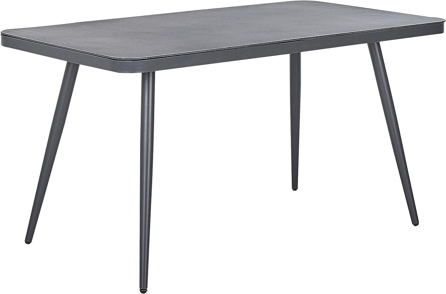 Praktischer Gartentisch mit einer stabilen Sicherheitsglasplatte in edler Steinoptik. Der Tisch eignet sich ideal für den Außenbereich und bietet mit seinen hohen, schlanken Aluminiumbeinen einen modernen Look. Genießen Sie gesellige Stunden im Garten, auf der Terrasse oder dem Balkon. Mit einer maximalen Belastung von 200 kg und einer pflegeleichten Oberfläche ist dieser Tisch sowohl funktional als auch langlebig. **Highlights** - Stabile Tischplatte aus Sicherheitsglas für hohe Sicherheit - Modernes Design in edler Steinoptik - Speziell für die Nutzung im Außenbereich entworfen - Besonders pflegeleicht und langlebig - Schutzkappen zum Schutz des Bodens **Produkteigenschaften** - Typ: Gartentisch - Stil: Industriell - Farbe: Grau - Farbton: Dunkelgrau - Material: Aluminium / Sicherheitsglas - Gestellmaterial: Metall - Tischplattenmaterial: Glas - Form: Rechteckig - Finish: Pulverbeschichtet - Maße (LxBxH): 140 x 80 x 75 cm - Gewicht: 22,6 kg - Max. Belastung: 200 kg - Beständigkeit: Feuchtigkeitsbeständig, Windbeständig, UV-beständig, Rostbeständig **Lieferumfang** - 1 x Tisch - Nicht montiert, Montagezeit: 20 - 40 Min.