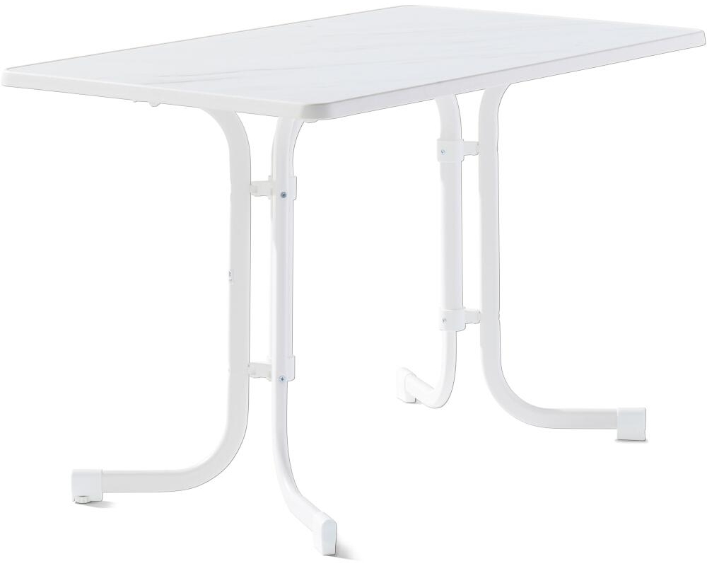 Der SIEGER Boulevard-Klapptisch ist ein praktisches und langlebiges Gartenmöbelstück mit den Abmessungen 115 x 70 x 72 cm. Das wetterfeste und hitzebeständige Stahlrohrgestell in Weiß sorgt für Stabilität, während die schlagfeste Mecalit®-Pro-Platte mit eleganter Dekoroberfläche eine hohe Verarbeitungsqualität bietet. Der Tisch ist montagefrei und ideal kombinierbar mit anderen Möbeln aus dem SIEGER-Sortiment. **Highlights** - Wetterfest, hitzebeständig und säurefest - Schlagfeste und kantenstabile Mecalit-Pro-Platte mit Dekoroberfläche - Stabiles Stahlrohrgestell mit 4 Beinen aus witterungsbeständigem Stahl-Flachovalrohr - Elegantes Design mit weißem Strukturrand - Montagefrei und ideal kombinierbar mit anderen Möbeln aus dem SIEGER-Sortiment **Produkteigenschaften** - Abmessungen: 115 x 70 x 72 cm - Material: Stahlrohrgestell, Mecalit-Pro-Platte - Farbe: Weiß - Stahlrohrgestell mit einer Rohrstärke von 35 x 20 mm - Original mecalit®-Pro Marmordekorplatte mit weißem Strukturrand - Witterungsbeständig und polyesterbeschichtet - Hohe Verarbeitungsqualität für eine lange Lebensdauer - Made in Germany - EAN: 4003348991364