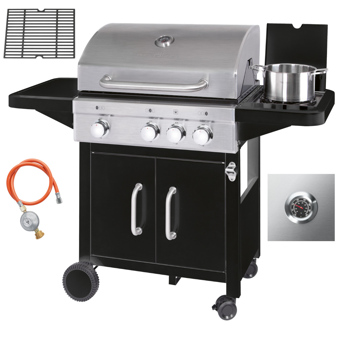 Der ProfiCook Gasgrill PC-GG 1219 Gußeisen Rost hat eine mittelmäßige Verarbeitung und ist im mittleren Preissegment angesiedelt. Der Aufbau ist einfach, aber der Unterbau hat zu dünne Bleche und die Blenden sind schnell verbiegbar. Die Abtropfpfanne mit Auffangschale ist gut zu handhaben, aber die Brennerabdeckungen sind nicht fest montiert. Die Reinigung ist schwierig, da überall Fett runtertropft. Ein Kunde hatte Probleme mit dem Gasanschluss zum Seitenbrenner, da der Schlauch in einer "Düse" endet und das Rohr der Kochstelle darüber hinausgeht, was das Ausströmen von Gas ermöglicht. Der Kundendienst konnte nicht helfen und es gab keine Lösung.