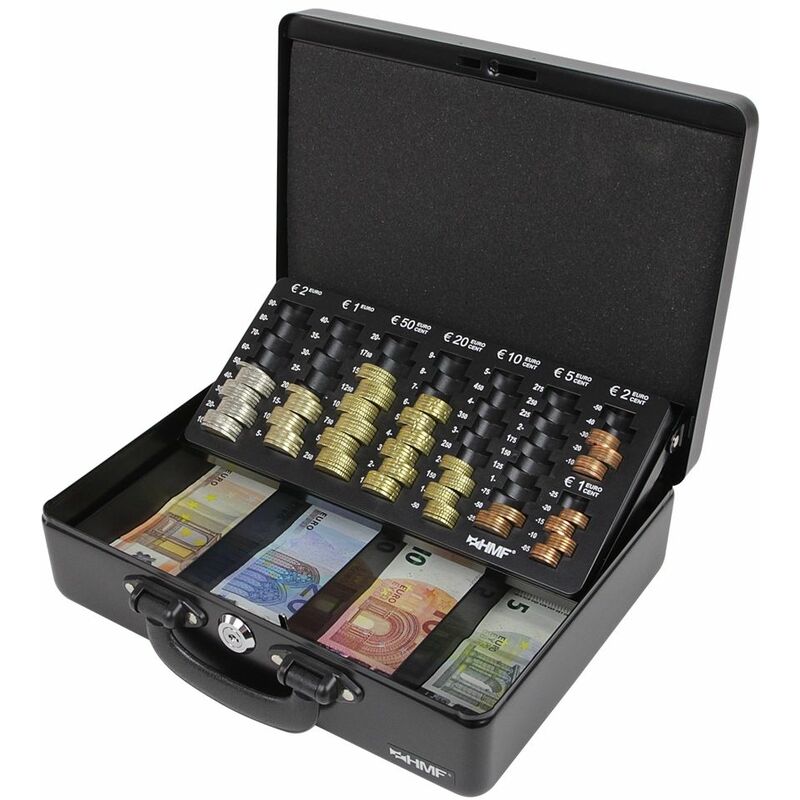 Die HMF Geldkassette mit Tragegriff bietet eine praktische Lösung zur sicheren Aufbewahrung von Bargeld. Dank der großen Scheinfächer und dem angehobenen Münzfach können Geldscheine und Münzen ordentlich sortiert werden. Die Polsterung im Deckel sorgt zudem dafür, dass die Münzen beim Transport geschützt sind. Mit zwei Tragegriffen ist die Kassette einfach zu transportieren und eignet sich ideal für Verkaufsstände oder Märkte.