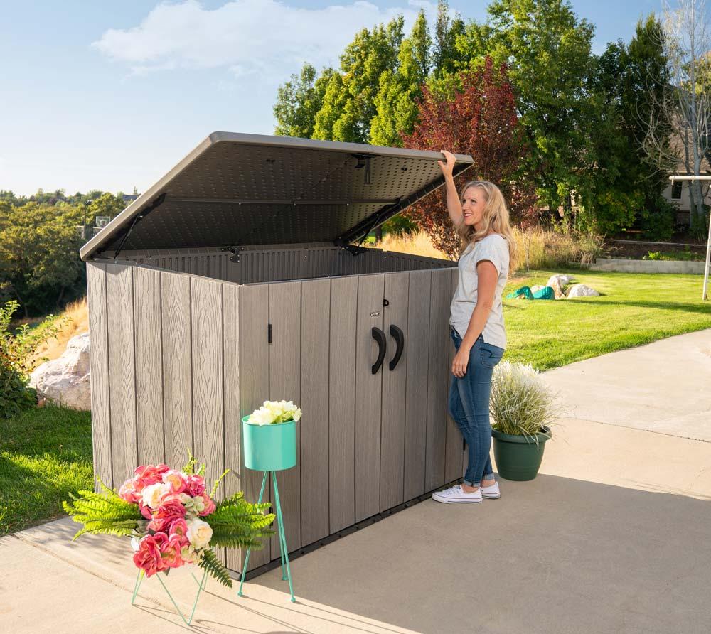 Die Kunststoff Mülltonnenbox & Geräteschrank Greg von Lifetime ist langlebig, praktisch und geräumig. Sie besteht aus strapazierfähigen Kunststoff-Wabenplatten und lässt sich dank des Stecksystems schnell montieren. Die Box bietet Platz für 3 Mülltonnen mit je 240 Litern Fassungsvermögen und versteckt diese hinter einem Korpus aus hochwertigen Kunststoff-Wabenplatten. Neben der optischen Aufwertung der Mülltonnen schützt die Box auch vor Sonneneinstrahlung und verhindert so eine intensive Geruchsentwicklung. Die beiden Fronttüren und der Deckel der Mülltonnenbox lassen sich vollständig öffnen, um die Mülltonnen problemlos einzuschieben und zu platzieren. Der Deckel verfügt über 2 Ketten-Aufhängungen, an denen die Deckel der Mülltonnen befestigt werden können. Zwei Gasdruckdämpfer halten den Deckel der Box aufrecht und verringern das Verletzungsrisiko. Alternativ kann die Mülltonnenbox auch als Gartenschrank oder Geräteschuppen verwendet werden, um für Ordnung auf dem Grundstück zu sorgen. **Highlights** - Stauraum für 3 Mülltonnen je 240 L - Aus doppelwandigen Kunststoff-Wabenplatten | 26 mm | HDPE - Besonders hochwertig & strapazierfähig - UV-beständig, farbtreu und wasserabweisend - Zusätzliche Stabilität durch Metallverstärkung **Produkteigenschaften** - Abmessungen: 108 x 191 x 131 cm (Höhe x Breite x Tiefe) - Material: Kunststoff-Wabenplatten - Farbe: Grau/Braun - Inklusive 2 Gasdruckfedern und 2 Kettenaufhängungen für Mülltonnendeckel - Vorrichtung für Hängeschloss vorhanden **Lieferumfang** - Kunststoff Mülltonnenbox & Geräteschrank Greg - Montagematerial