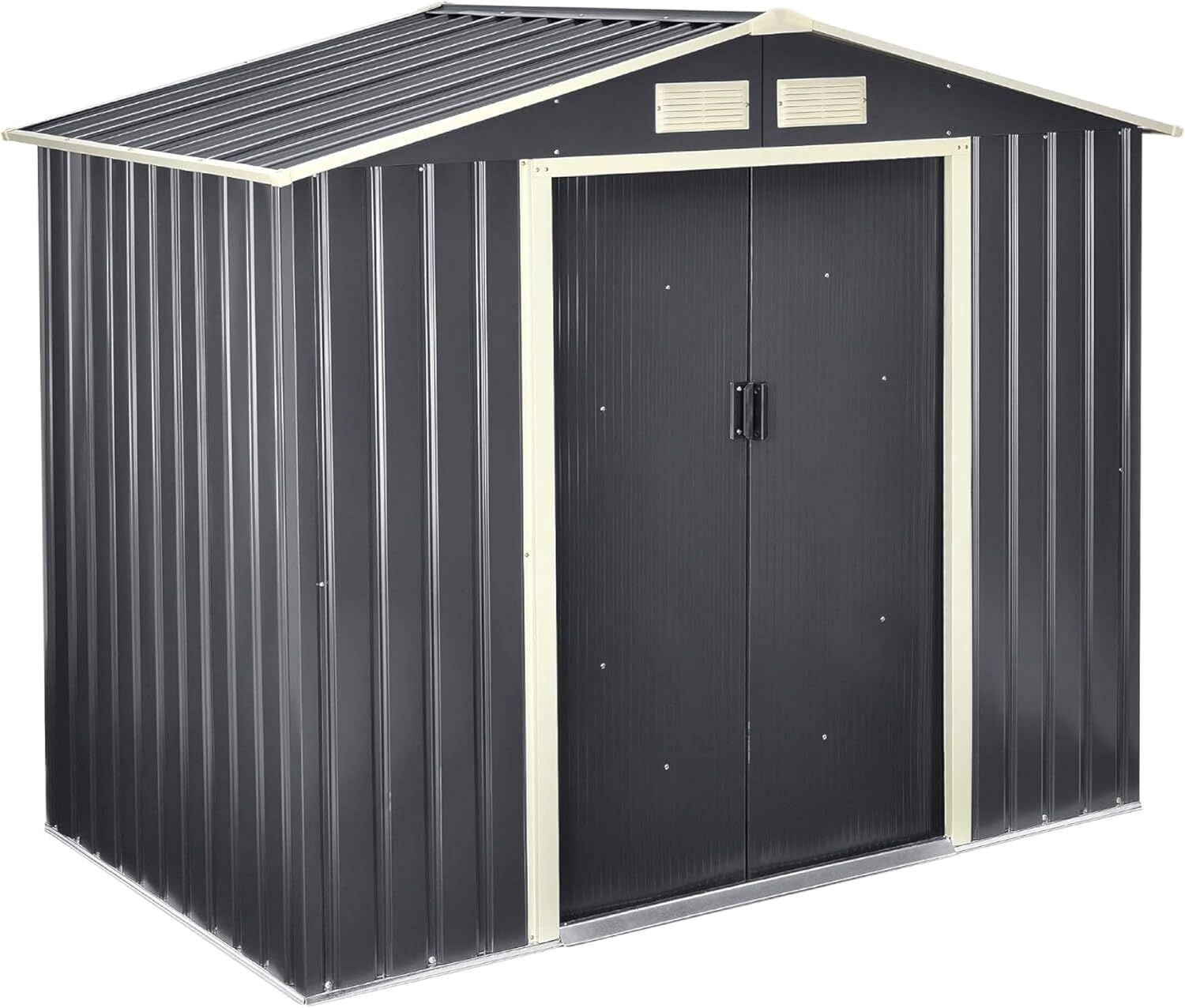 Mit dem Gartenschuppen von en. casa schaffen Sie Ordnung in Ihrem Außenbereich. Der stabile und wetterfeste Geräteschuppen aus feuerverzinktem Stahlblech bietet idealen Stauraum für Gartenmöbel, Gartengeräte und Fahrräder. Die zweigeteilte Schiebetür ermöglicht einen einfachen Zugang, während das Satteldach Regenwasser abführt. Mit einer Gesamtgröße von 213 x 127 x 185 cm und einem Lagerplatz von ca. 4 m³ ist dieser Schuppen die perfekte Lösung für Ihre Aufbewahrungsbedürfnisse. **Highlights** - Robustes und wetterfestes Gerätehaus für den Außenbereich - Zweigeteilte und raumsparende Schiebetür, separat zu öffnen - Abschließbar mit Vorhängeschloss (Schloss nicht im Lieferumfang) - Gute Luftzirkulation durch 4 Belüftungsgitter (2 vorne, 2 hinten) - Stabiles Satteldach lässt Regenwasser ablaufen **Produkteigenschaften** - Material: Stahlblech, feuerverzinkt - Rahmen: Metall - Dachkantenschutz: Kunststoff - Maße (LxBxH): 213 x 127 x 185 cm - Abstand vom Boden zur unteren Dachkante: 152 cm - Innenmaße (LxBxH): 203 x 117 x 185 cm - Sockelmaß (LxB): 203 x 117 cm - Eingang (BxH): 96 x 150 cm - Lagerplatz: ca. 4 m³ - Farbe: Dunkelgrau **Lieferumfang** - 1 x Geräteschuppen - 1 x Aufbauanleitung