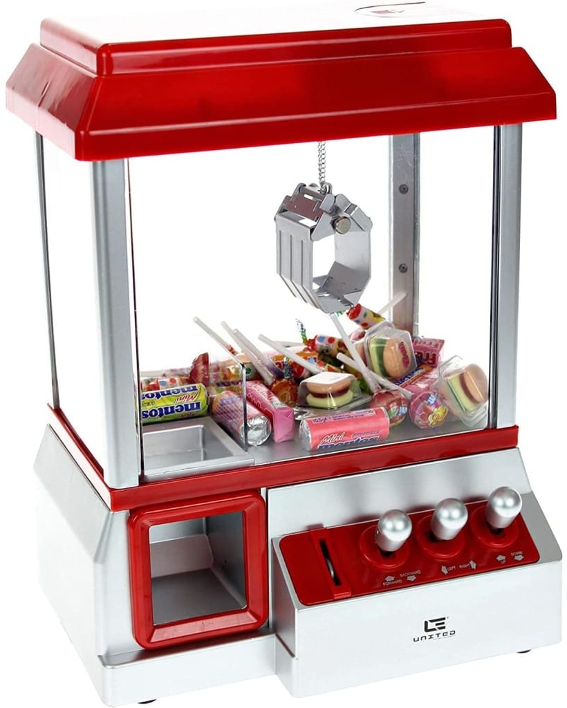 Mit dem Candy Grabber von United Entertainment bringen Sie die gemütliche Atmosphäre eines Jahrmarktes in Ihr Haus! Es ist ein lustiges Geschicklichkeitsspiel für Jung und Alt, da Sie Ihre Angehensweise endlos üben können, um die Süßigkeiten Ihrer Wahl zu ergattern. Stecken Sie eine Spielmünze (oder eine echte Münze) in das Gerät und betätigen Sie die drei Joysticks, um Ihre Süßigkeiten zu greifen und über die Öffnung heraus zu nehmen. Sobald die Münze fällt, hören Sie eine fröhliche Melodie und haben eine Minute Zeit, um Ihre Süßigkeiten zu schnappen. Wenn es nicht sofort klappt, Ihre Lieblingssüßigkeit zu schnappen, dann üben Sie einfach weiter! Glücklicherweise können Sie Ihre Münzen am Boden der Maschine wieder erhalten, wenn Ihnen das Geld ausgeht. Hinweis: Das Gerät funktioniert am besten mit leichten (verpackten) Süßigkeiten.