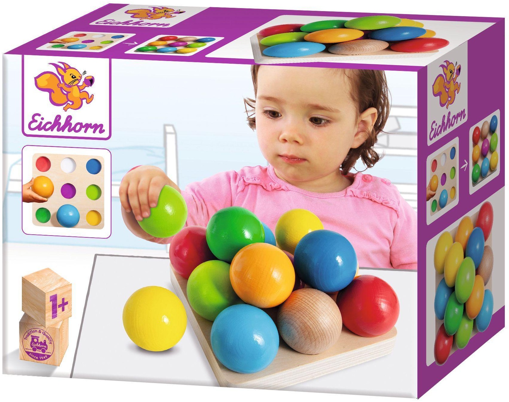 | Beschreibung | Eichhorn Kugel-Sortierspiel: Das 15 teilige Kugel-Sortierspiel von Eichhorn lehrt den Kleinen den Umgang mit verschiedenen Farben und das Sortieren danach. Die 14x14 cm große Holzplatte besteht aus Buchenholz und besitzt 9 Vertiefungen in welche die enthaltenen farbigen Plättchen variabel gelegt werden können. Je nach Farbe in den Vertiefungen können die 14 Kugeln zusortiert und zu einer bunten Pyramide gestapelt werden. Für Kinder ab einem Jahr geeignet. |