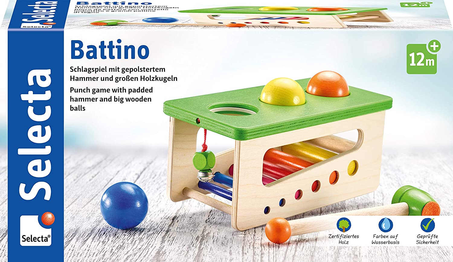 | Beschreibung | Das Schlagspiel für Kinder ab 1 Jahr. Mit dem gepolsterten Hammer kann man so richtig draufhauen - ganz wie man will, mal laut, mal leise. Battino hat das Zeug zum Lieblingsspiel! |