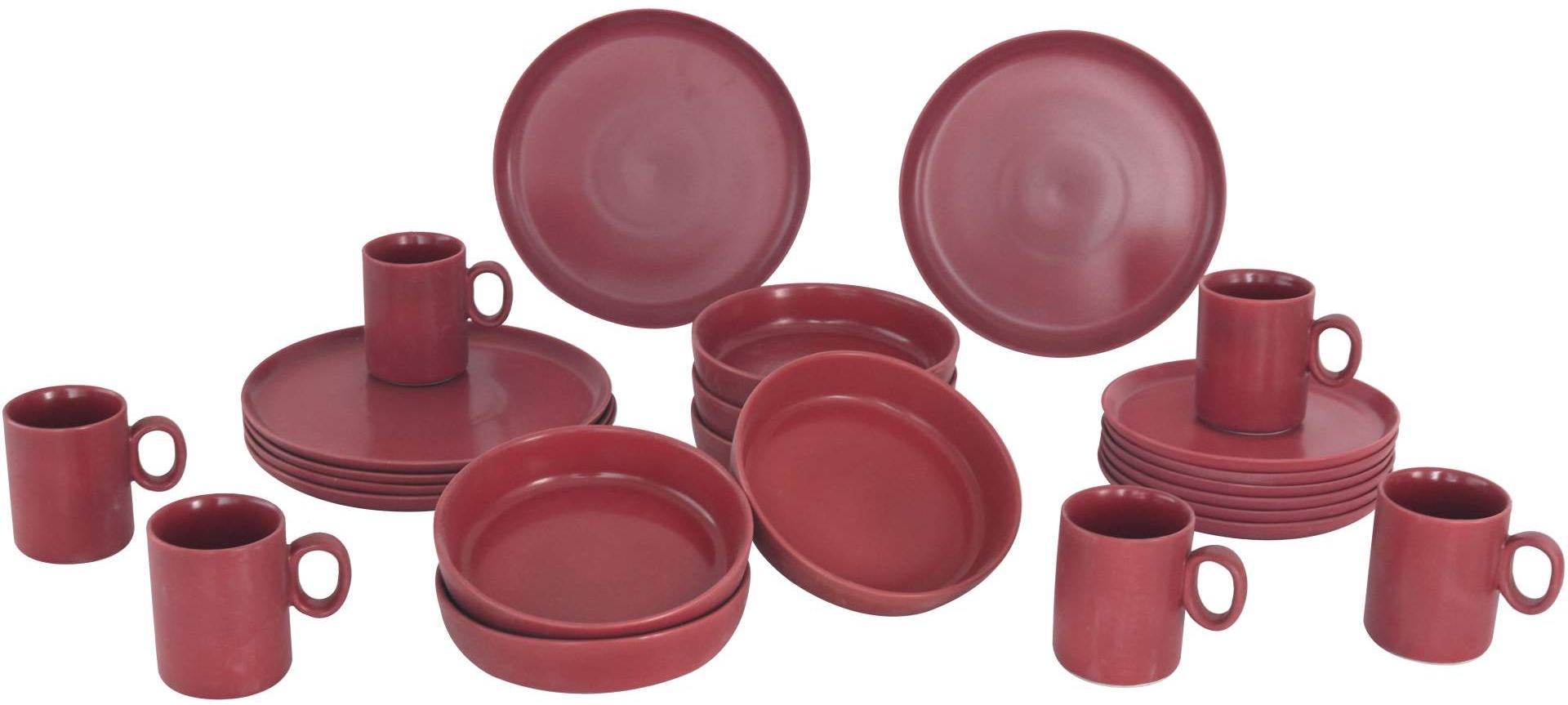 **Kurzbeschreibung:** 24 tlg. Komplettservice im trendigen Bordeauxrot für Kaffee- oder Tafelrunden bis 6 Personen Dieses Kombi-Service aus dickwandigem Porzellan und der seidenmatten Lackierung ist ein Hingucker bei jeder Tafelrunde. Bestehend aus 24 Teile: 6 x Kaffeebecher groß (32,0 cl) 6 x Kuchenteller 6 x Speiseteller 6 x Bowl-Schalen Robuste und schwere Qualität mit rauer Oberfläche und angenehmen Farbakzent in Weinrot. Spülmaschinen- und Mikrowellengeeignet. **Technische Daten:** - Kaffeebecher je: Ø 7,7 x H 10 cm - Kuchenteller je: Ø 20,4 x H 1,7 cm - Speiseteller je: Ø 27 x H 2 cm - Bowl-Schalen je: Ø 19 x H 4,1 cm **Modell Bezeichnung:** Mika **Marke:** VAN WELL **Hersteller:** van Well & Co. GmbH & Co. KG **Grösse:** 24 teilig **Gewicht:** 14 kg **Material:** Porzellan **Farbe:** Bordeaux **Lieferumfang:** 1 x Van Well Porzellan Kombiservice MIKA 24 teilig in Bordeaux.