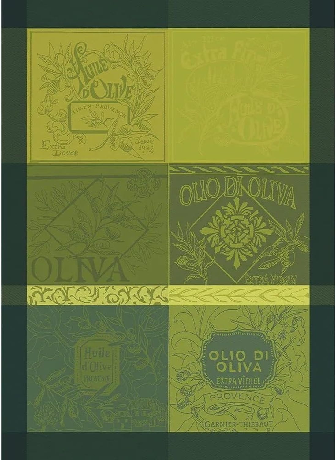 Garnier-Thiebaut Geschirrtuch Olive Vintage Vert 56 x 77 cm ist aus 100 % extra langstapeliger Baumwolle gefertigt und überzeugt durch sein saugfähiges Jacquard-Damastgewebe. Mit einer großzügigen Größe von 56 x 77 cm und einem praktischen Hakenetikett zum einfachen Aufhängen ist es ideal zum Trocknen von Geschirr und Händen. Das ansprechende Design mit Oliven und Olivenöl in verschiedenen Grüntönen verleiht Ihrer Küche einen Hauch von Provence und französischem Stil. **Highlights** - 100 % extra langstapelige Baumwolle für hohe Saugfähigkeit - Jacquard-Damastgewebe für eine edle Optik - Praktisches Hakenetikett zum einfachen Aufhängen - Stilvolles Design mit Olivenmotiven in verschiedenen Grüntönen - Hergestellt in Frankreich, traditionell und umweltbewusst **Produkteigenschaften** - Maße: 56 x 77 cm - Maschinenwaschbar - Dunkelgrüner Akzentrand für zusätzlichen Stil - Ideal als Geschenkidee für Gastgeber