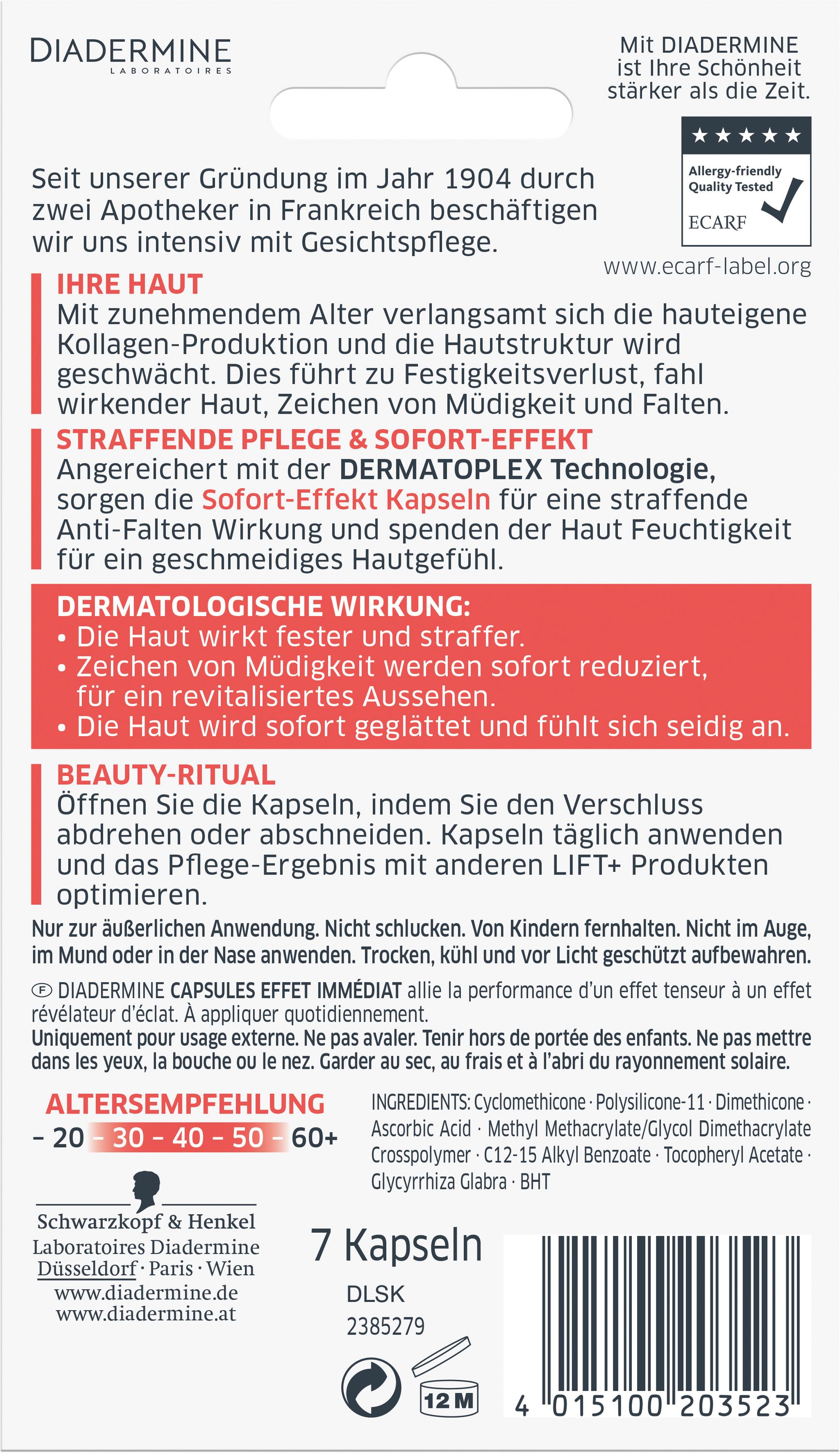Die DIADERMINE Lift LIFT Kapseln bieten eine sofortige glättende und erfrischende Wirkung auf die Haut. Durch ihre pflegende Formel bringen sie Feuchtigkeit und Frische, was zu einem angenehmen Hautgefühl führt. Viele Kunden loben die Effektivität der Kapseln und empfinden die Wirkung als sehr gut.