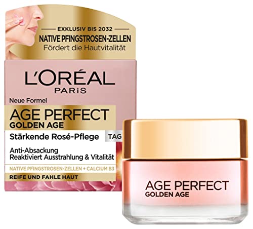 Die L'Oréal Paris Age Perfect Golden Age Stärkende Rosé-Tagespflege ist eine speziell für reife und fahle Haut entwickelte Anti-Aging Gesichtscreme. Sie enthält Pfingstrosen-Extrakt, der der Haut Festigkeit und Glanz verleiht. Die Creme zieht schnell ein, spendet viel Feuchtigkeit und sorgt für ein angenehmes Hautgefühl. Nach regelmäßiger Anwendung fühlt sich die Haut straffer an und sieht glatter aus. Der zarte Rosé-Ton sorgt für eine gesunde Ausstrahlung.