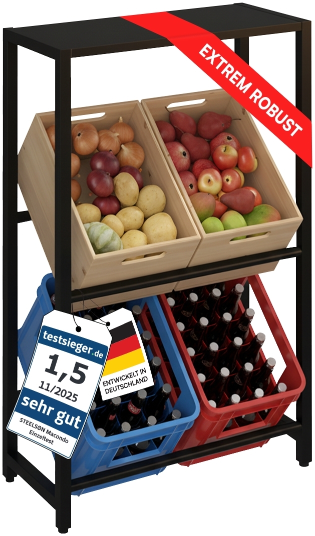 Das Getränkekistenregal 'Macondo' von STEELSØN vereint funktionale Eleganz mit robuster Stahlkonstruktion. Sein zeitloses Design passt sich nahtlos jeder Umgebung an und sorgt für eine geordnete und platzsparende Lagerung von Getränkekisten. **Hochwertige Materialien für maximale Stabilität** Gefertigt aus verzinktem Stahl mit einer Rahmenstärke von 25 mm, ist das Getränkekistenregal 'Macondo' extrem stabil und langlebig. Die stoß- und kratzfeste Oberfläche garantiert eine zuverlässige Nutzung – ideal für den Einsatz in Küche, Keller oder Büro. **Platzsparendes Design mit praktischen Funktionen** Das Regal Platz für **bis zu 4 klassische Getränkekisten**. Die Ablageflächen sind ergonomisch gestaltet, sodass das Entnehmen und Aufstellen der Kisten mühelos gelingt. Höhenverstellbare Füße sorgen für einen sicheren Stand, auch auf unebenen Böden. **Beeindruckende Belastbarkeit** Jede Kistenablage ist mit **100 kg** belastbar, während der Regalboden zusätzlich bis zu **20 kg** tragen kann. Dies macht das Getränkekistenregal zu einer zuverlässigen Lösung für Ihre Getränkevorräte. **Mehr als nur ein Regal** Das Getränkekistenregal 'Macondo' ist mehr als eine einfache Aufbewahrungslösung. Es optimiert Ihren Stauraum, hält Ihre Getränkekisten jederzeit griffbereit und bringt Ordnung und Struktur in Ihren Wohn- oder Arbeitsbereich. **Produktdetails:** - Platz für 4 Kisten - Maße: 75 x 115 x 33 cm - Max. Belastbarkeit pro Getränkekistenablage: 100 kg - Max. Belastbarkeit Regalboden: 20 kg - Material: Stahl (Stahl-Epoxid-Pulverbeschichtung) - Inkl. höhenverstellbaren Füßen - Einfache und schnelle Montage