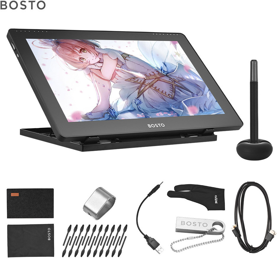 • Das BOSTO 16HDK Grafiktablett bietet einen 15,6-Zoll H-IPS-LCD-Bildschirm mit hoher Auflösung und lebendigen Farben