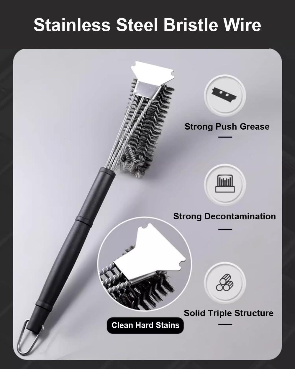 Präzise und effiziente Reinigung für Ihren Grill bietet das 2er-Pack Grillbürsten- und Reinigungsset. Mit einer 45 cm langen Grillbürste, die Ihre Hände vor Hitze schützt, und einer 3-in-1-Funktion, die eine 360°-Reinigung ermöglicht, wird das Grillen zum Vergnügen. Die Edelstahlborsten und der rutschfeste Griff sorgen für eine mühelose Handhabung und eine gründliche Reinigung. **Highlights** - 2er-Pack Grillbürsten für vielseitige Reinigung - 3-in-1-Grillbürste mit 360°-Reinigungsfunktion - 45 cm lange Grillbürste schützt vor Hitze - Rutschfester Griff für sicheren Halt - Breitere Schaber für schnellere Reinigung **Produkteigenschaften** - Material: Edelstahl - Länge der Grillbürste: 45 cm - Dreilagige Bürsten für effektive Reinigung - Reinigt bis zu 5-mal schneller als herkömmliche Grillbürsten - Dicht spiralförmiger 3-reihiger Bürstenschwamm **Lieferumfang** - 2x Grillbürsten - 1x Haken zum Aufhängen