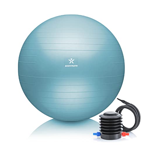 BODYMATE Gymnastikball Sitzball Trainingsball mit GRATIS E-Book inkl. Luft-PumpeBall für Fitness, Yoga, Gymnastik, Core Training, für starken Rücken als Büro-Stuhl ICY Blue 65cm