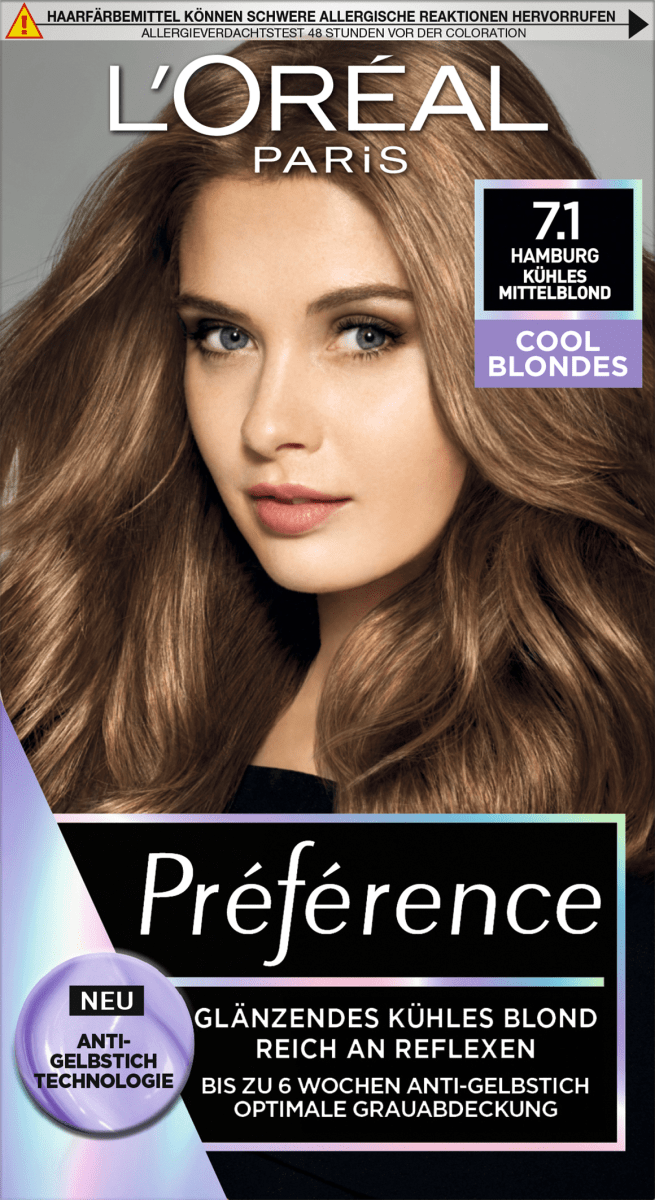 Die L'Oréal Paris Preference Haarfarbe in der Farbe "Kühles Mittelblond" bietet ein gutes Farbergebnis ohne Gelb- oder Orangestich. Die Haarfarbe ist einfach anzuwenden und überzeugt mit einem angenehmen Duft. Nach der Anwendung fühlen sich die Haare gesund und gepflegt an, zudem deckt die Farbe gut ab und hält, was versprochen wird. Sie erreicht einen kühlen Farbton ohne Rotstich und sorgt für eine schöne Farbe sowie Glanz.