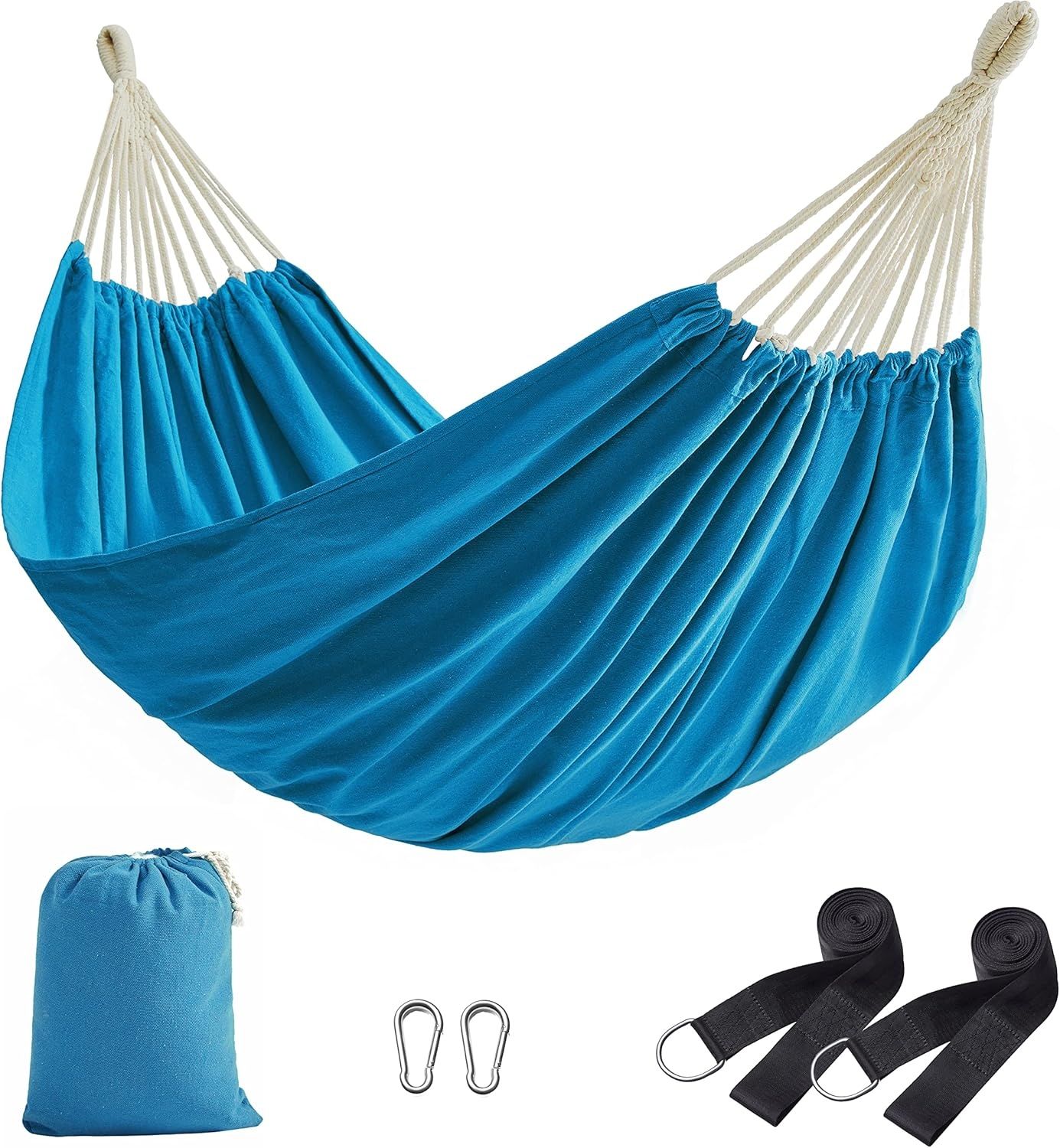 | Name | SONGMICS Hängematte, 210x150 cm, Doppelhängematte, Belastbarkeit 300 kg, für Garten, Terrasse, Balkon, Outdoor, Camping, mit Tragetasche, Befestigungsgurten und Karabinern, blau GDC15BU |