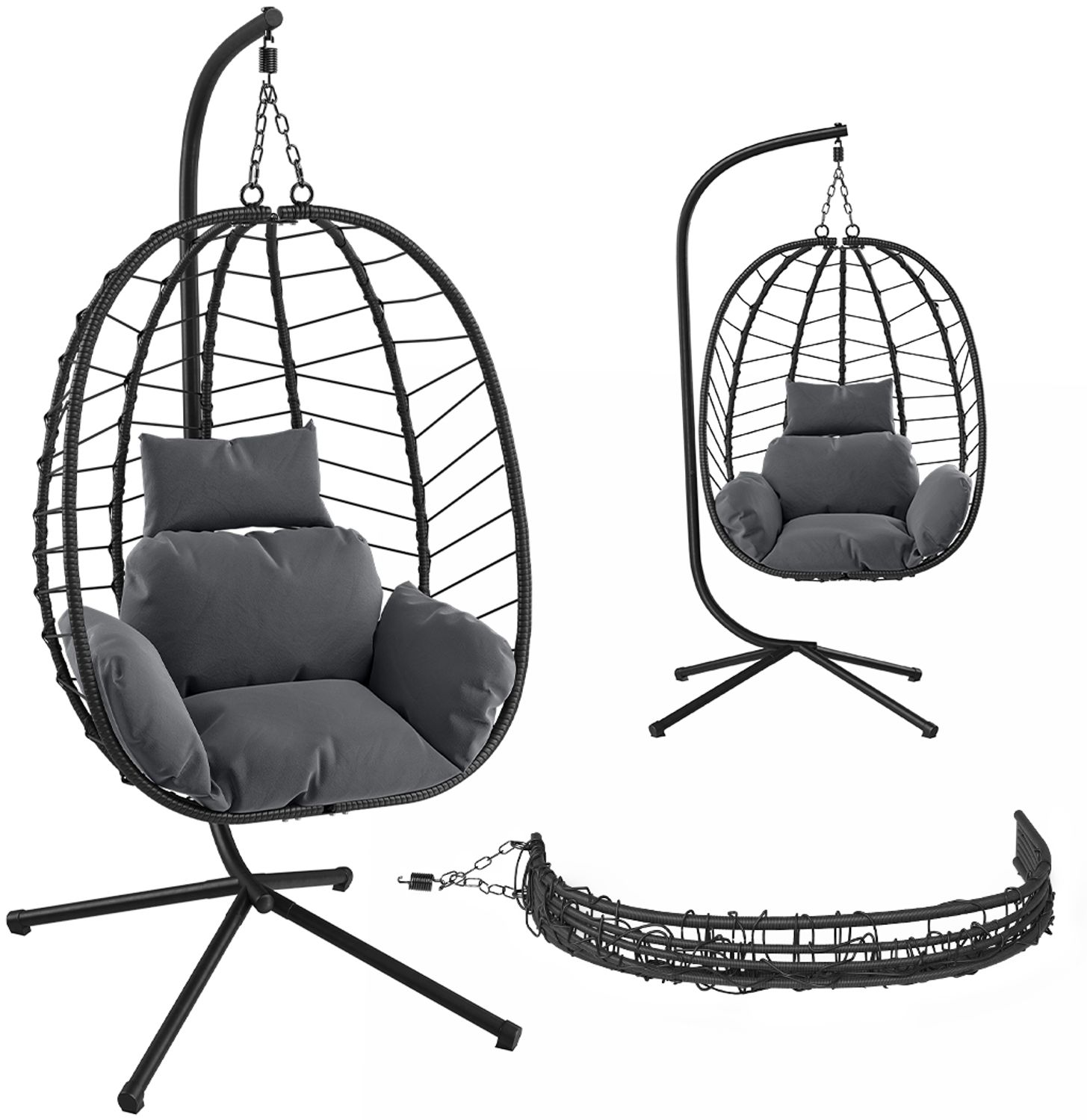 | Name | STEELSØN 'Alarian' Hängesessel mit Metallgestell, höhenverstellbar und faltbar, wetterfest, Polyrattan, dunkelgrau/schwarz, bis 150 kg belastbar, inkl. Kissen |