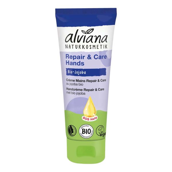 • Die alviana Handcreme Repair & Care ist speziell für die Bedürfnisse von trockener und strapazierter Haut konzipiert und bietet Intensivpflege dank hochwertigem Bio-Jojobaöl.