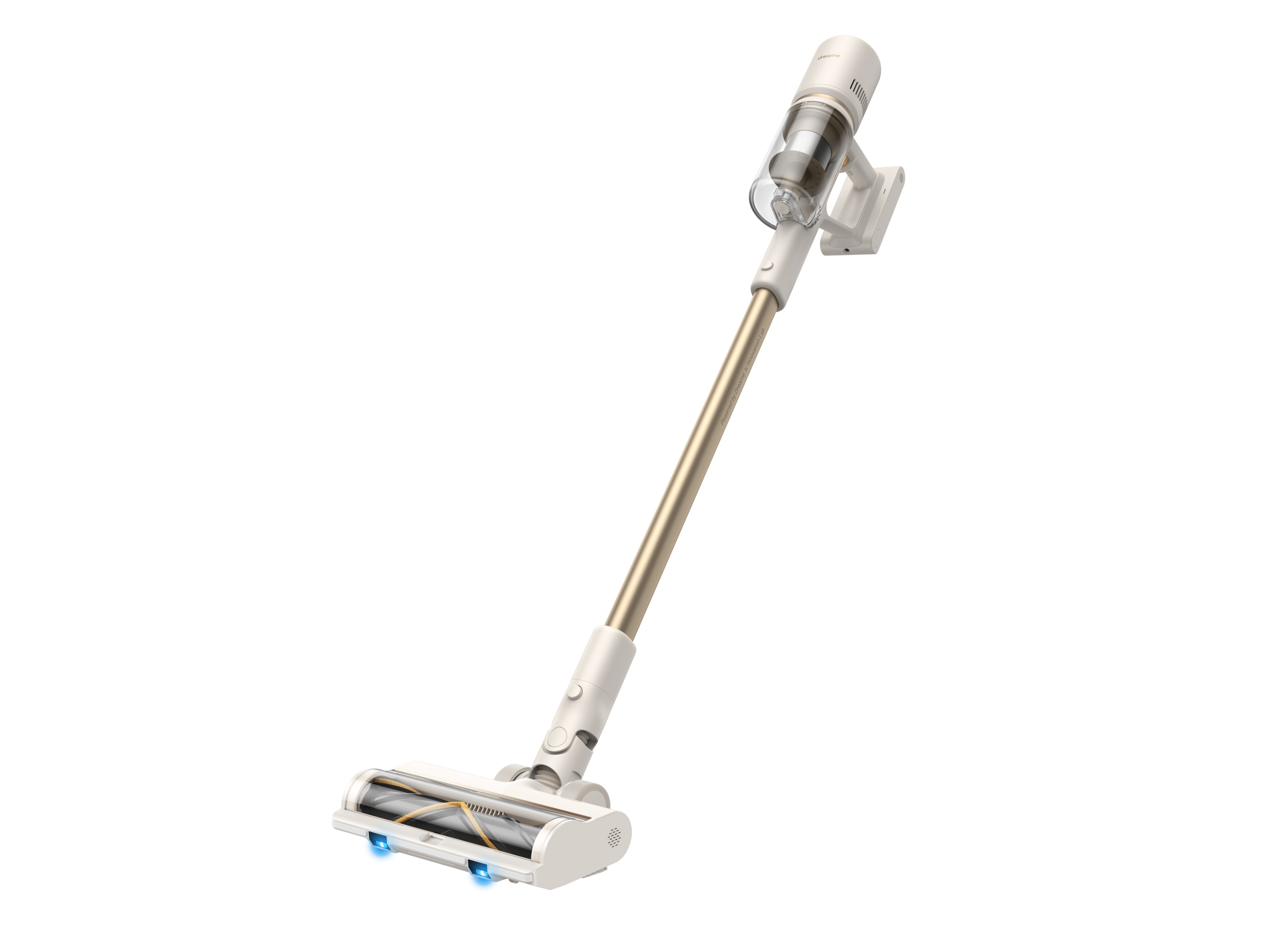 Der Dreame U20 präsentiert sich in einem ansprechenden Design in den Farben weiß und gold. Die Verarbeitung wirkt robust und gut durchdacht. Das Gewicht des Geräts ist für einen kabellosen Staubsauger durchschnittlich, was eine einfache Handhabung ermöglicht. Der Bürstenkopf ist mit blauen LEDs ausgestattet, die es ermöglichen, auch in dunklen Bereichen Staub zu erkennen. Dies ist besonders hilfreich unter Möbeln oder in Ecken, wo herkömmliche Beleuchtung nicht ausreicht.