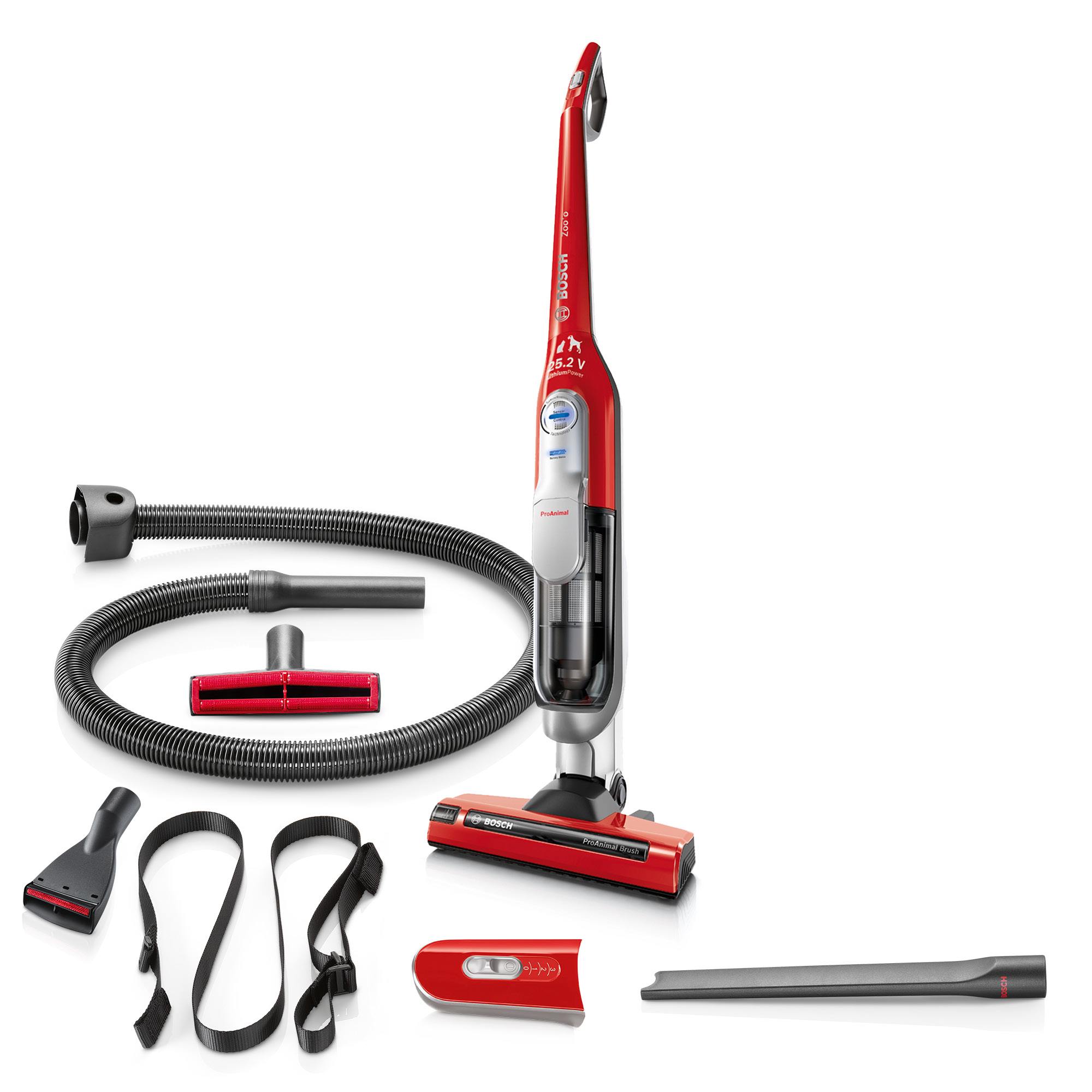 Der Bosch BCH6ZOOO präsentiert sich in einem modernen roten Design, das sowohl ansprechend als auch funktional ist. Mit einem Gewicht von nur 3 kg und den kompakten Abmessungen von 28,5 x 116 x 18,5 cm ist der Staubsauger leicht zu handhaben und findet auch in kleinen Räumen Platz. Die Freistehend-Funktion erlaubt es, das Gerät ohne Umstände abzustellen, was die Aufbewahrung erleichtert.