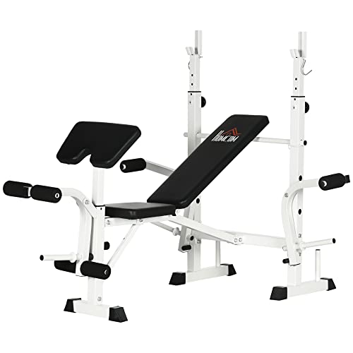 HOMCOM Multifunktionale HantelbankVerstellbare Trainingsbank mit Hantelablage, Brustpresse, Beinpresse, Armauflage, Spoertbank für Gewichtstraining, Stahl, Schwarz+Weiß