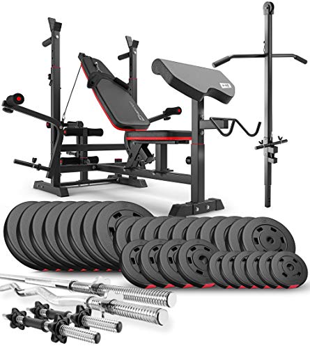 • Die Hantelbank Kraftstation HS-1075 von Hop-Sport bietet ein umfangreiches 165kg Hantelset, bestehend aus verschiedenen Hantelscheiben und Stangen