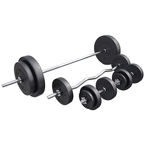 • Enthalten sind eine SZ-Curlhantelstange, eine Langhantelstange, 2 Kurzhantelstangen und verschiedene Gewichtsscheiben.