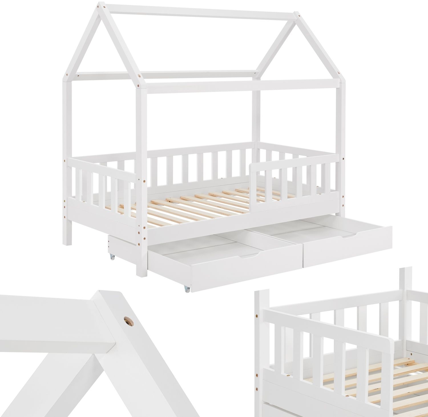 | Name | Juskys Kinderbett Marli 80x160 cm mit Bettkasten 2-teilig, Rausfallschutz, Lattenrost & Dach - Massivholz Hausbett für Kinder - Bett in Weiß |