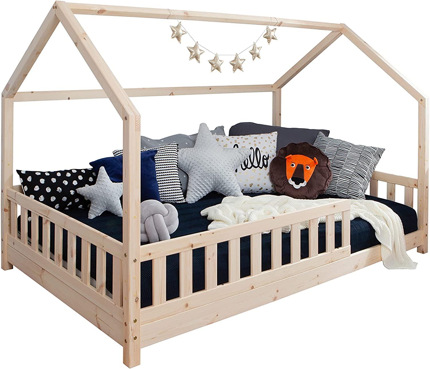 Ein richtiger Kindertraum - dieses hochwertige, minimalistische Hausbett, in edler Optik, lädt zum Träumen ein und bietet deinem Schatz einen Ort zum Wohlfühlen und Austoben. - Das aus massiver Kiefer gefertigte Bett bietet eine Liegefläche von 120x200 cm. - Der individuellen Gestaltung deines Hausbettes sind keine Grenzen gesetzt. So macht das Toben richtig Spaß. Besonderheiten - Hausbett, inkl. Dachaufbau Inkl. Rollrost - Mit Fallschutz - Höhenverstellbar - Aus massiver Kiefer gefertigt - Bodennahes Kinderbett - Der Rausfallschutz ist variabel rechts oder links montierbar - Liegefläche 120x200 cm **Abmessungen Bett** - Tiefe: 127 cm - Breite: 209 cm - Höhe: 139 cm - Rausfallschutz Höhe: 29 cm - Schenkelmaß: 78 cm - Pfostenhöhe zum Giebel 93 cm - Bodenfreiheit: 5 cm oder 21 cm (höhenverstellbar) - Material: Kiefer-Massivholz Lieferumfang Hausbett, inkl. Rollrost Montagematerial Montageanleitung, *Ohne Dekoration Matratze separat erhältlich*