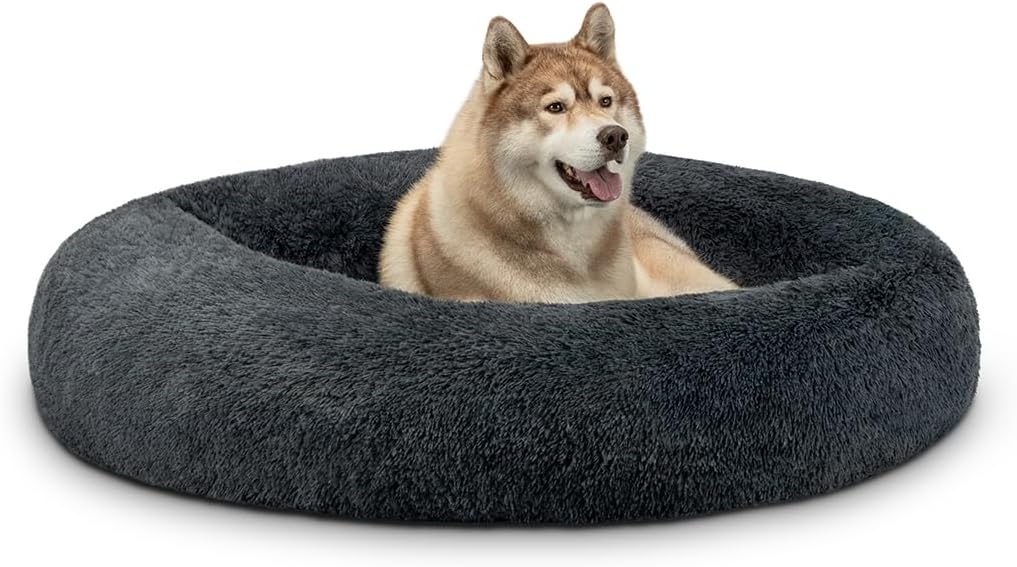 | Name | lionto Donutbett für Hunde und Katzen, Flauschiges Hundebett rund für kleine und große Heimtiere, Ø 120 cm, weiches Katzenbett aus kuscheligem Plüsch, Hundekissen mit extra Dicker Füllung, dunkelgrau |