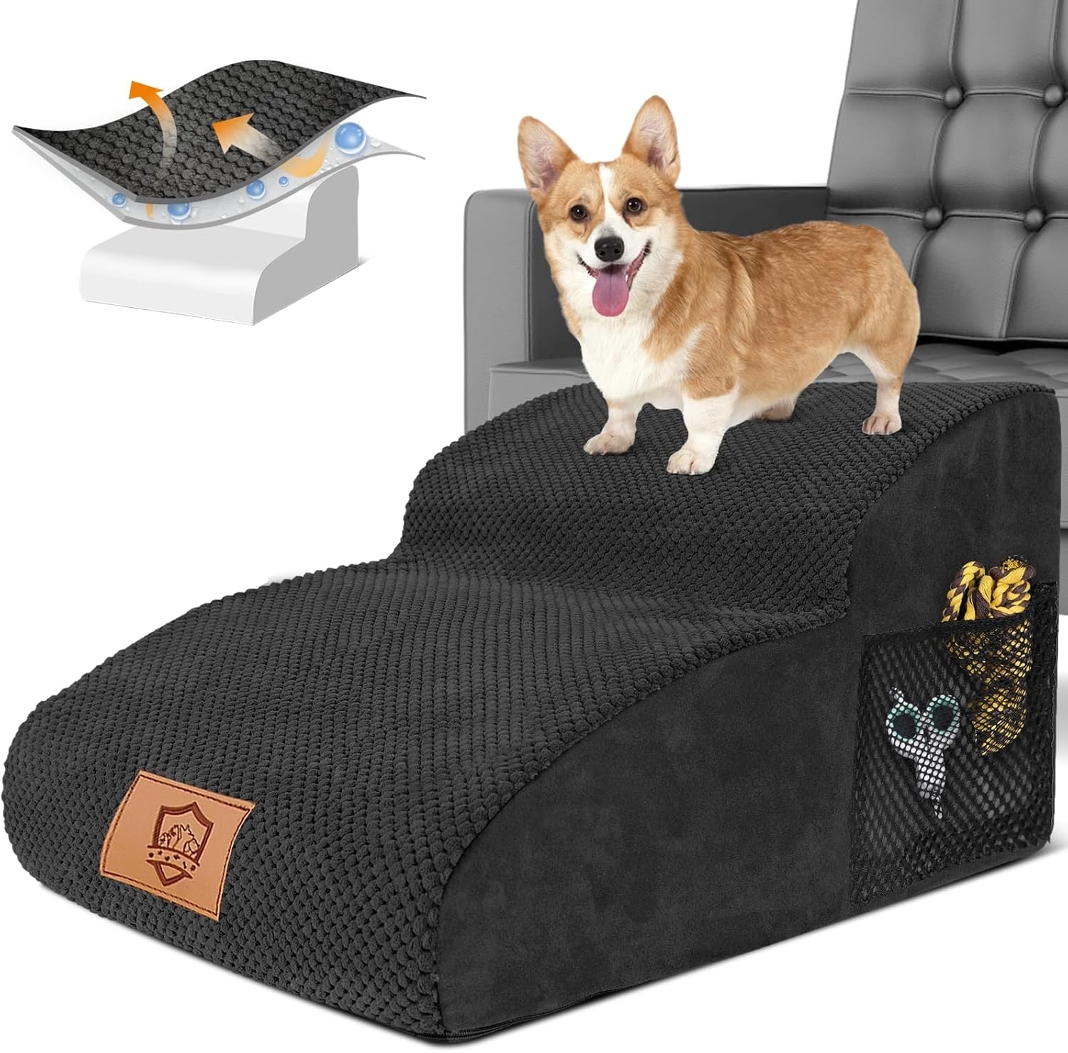 【Verlängerte 2-stöckige Leiter】 – Die Hundetreppe hat die Maße 55 x 40 x 30 cm. Wir haben die Länge der ersten Stufe verlängert, um der Leiter eine sanftere Neigung zu geben, was es Ihrem Haustier erleichtert, hinaufzuklettern. Die 2-stöckige Haustierleiter hilft Ihrem Haustier, die meisten Sofas zu erreichen, und ist für Haustiere mit einem Gewicht von bis zu 50 lbs (ca. 22 kg) geeignet. 【Schützt die Gelenke Ihres Haustieres】 – Diese Haustierleiter besteht aus komprimierbarem 30D-Schaumstoff, der elastisch ist und sich nicht leicht verformt, sodass sie auch langfristig verwendet werden kann. Der Schaumstoff ist weich und flauschig, besonders geeignet für ältere Hunde, da er ihre Gelenke schützt und ihre Pfoten entlastet. Ideal für Haustiere mit Gelenk- oder Beinproblemen. 【Wasserdichter Stoffbezug】 – Der abnehmbare Bezug besteht aus hochwertigem Cordstoff mit einer strukturierten Oberfläche, die verhindert, dass Ihr Haustier ausrutscht. Zudem verfügt der Stoffbezug über eine wasserdichte Schicht, die verhindert, dass Flüssigkeiten in den Schaumstoff eindringen. Der Bezug ist maschinenwaschbar. 【Niedlicher Pfotenabdruck aus Silikon】 – Die Unterseite der Haustierleiter ist mit niedlichen Pfotenabdrücken aus Silikon versehen. Diese sehen nicht nur schön aus, sondern sorgen auch für Rutschfestigkeit, sodass die Leiter sicher steht und verhindert, dass Ihr Haustier beim Klettern verletzt wird. Der rutschfeste Silikonaufdruck schützt Ihr Haustier zusätzlich. 【Bitte beachten Sie】 – Sobald Sie die Verpackung erhalten haben, öffnen Sie bitte die Vakuumverpackung. Der Schaumstoff benötigt 24 bis 48 Stunden, um seine vollständige Form wiederzuerlangen. Generell gilt: Je höher die Umgebungstemperatur, desto schneller erholt sich der Schaumstoff. Als Bonus erhalten Sie eine Fusselrolle, mit der Sie Tierhaare leicht von Bett oder Kleidung entfernen können. Diese Haustierleiter ist für Tiere mit einem Gewicht von bis zu 50 Pfund (ca. 22 kg) geeignet.