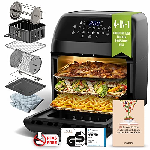 Die Stillstern Heißluftfritteuse mit 12 Litern Fassungsvermögen und LED-Touchscreen bietet eine Vielzahl von Vorteilen für ihre Nutzer. Mit diesem Gerät können Sie verschiedenste Gerichte fettarm und effizient zubereiten, dank der innovativen Heißluft-Technologie. Die antihaftbeschichteten Teile ermöglichen zudem eine einfache Reinigung nach dem Gebrauch. Das moderne Design des Geräts sowie der benutzerfreundliche Touchscreen machen die Bedienung besonders intuitiv.