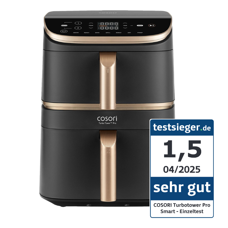 Laut der Testerinnen und Tester von c’t überzeugt die Cosori Turbo Tower Pro Smart mit ihrem flexiblen Zwei-Zonen-System und der komfortablen App-Steuerung. Die Garergebnisse sind gut, besonders wenn unterschiedliche Speisen gleichzeitig zubereitet werden. Wer bereit ist, etwas mehr zu investieren, bekommt eine clevere und leistungsstarke Heißluftfritteuse mit durchdachtem Konzept. – zusammengefasst durch die Testsieger.de-Redaktion