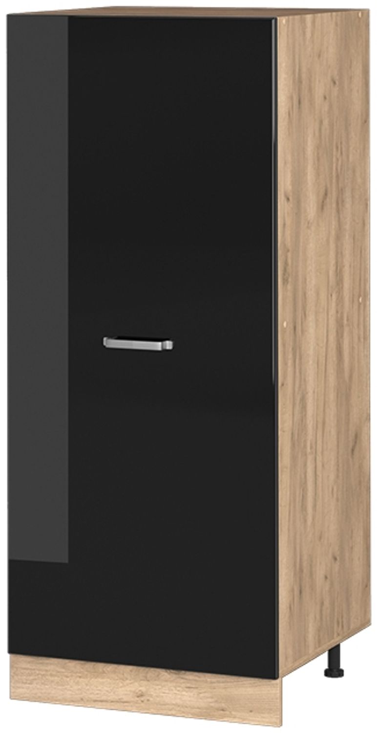 Der Vicco Vorratsschrank in Schwarz Hochglanz ist die ideale Lösung für Ihre Küche. Mit seinen kompakten Maßen von 60 x 143 x 57,2 cm (BxHxT) bietet er ausreichend Stauraum und passt sich dank höhenverstellbarer Füße perfekt an Ihre Gegebenheiten an. Der Schrank besteht aus robuster Spanplatte mit einer Melaminharzbeschichtung und hat ein ansprechendes Design in Goldkraft-Eiche und Schwarz. **Highlights** - Höhenverstellbare Füße für individuelle Anpassung - Hochwertige Melaminharzbeschichtung für Langlebigkeit - Geräumige Innenmaße für optimalen Stauraum - Elegantes Design in Schwarz Hochglanz - Robuste Materialien für eine lange Lebensdauer **Produkteigenschaften** - Maße (BxHxT): 60 x 143 x 57,2 cm - Innenmaße: 568 x 1327 x 550 mm - Innenmaße der oberen offenen Fächer: 568 x 287 x 550 mm, 568 x 295 x 550 mm - Innenmaße des unteren geschlossenen Fachs: 568 x 338 x 550 mm - Material: Spanplatte, 16 mm - Zusätzliches Material: MDF - Artikelgewicht: 43,93 kg - Artikelgewicht inkl. Verpackung: 46,9 kg **Lieferumfang** - Herdumbauschrank als Bausatz - Montageanleitung - Montagematerial - Hinweis: Dekoration nicht im Lieferumfang enthalten