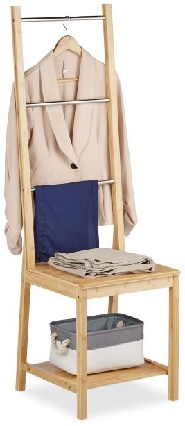 Der Herrendiener Stuhl aus Bambus und Edelstahl bietet Ihnen eine praktische Kleiderablage mit vielseitigen Einsatzmöglichkeiten. Mit 3 Stangen und 2 Ablagen haben Sie ausreichend Platz für Hosen, Oberteile, Krawatten und Schuhe. Die obere Ablage kann zudem als Sitzfläche genutzt werden. Der stilvolle Kleiderständer sorgt mit seinem warmen Farbton aus Bambus für ein natürliches Ambiente und eignet sich auch als Handtuchständer im Badezimmer. **Highlights** - Vielseitige Nutzung als Kleiderablage und Handtuchständer - Obere Ablage als Sitzfläche nutzbar - Ausreichend Platz auf 3 Stangen und 2 Ablagen - Fertigung aus Bambus für ein natürliches Flair - Ideal für Flur, Ankleide- und Schlafzimmer **Produkteigenschaften** - Maße H x B x T: ca. 133 x 40 x 42 cm - Sitzfläche B x T: ca. 40x37,5 cm, max. 80 kg - Untere Ablage B x T: ca. 35,5x33 cm, max. 15 kg - Sprossen B: ca. 34,5 cm, je max. 3 kg - Sprossenabstand: ca. 27 cm - Gewicht: ca. 5 kg - Material: Bambus, Edelstahl - Farbe: Natur, Silber **Lieferumfang** - 1x Kleiderdiener in Einzelteilen - Mit Anleitung und Montagematerial - Dekoartikel sind nicht im Lieferumfang enthalten