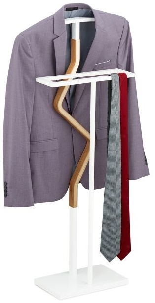Der Herrendiener aus Holz und Metall in Weiß bietet eine elegante Lösung zur faltenfreien Aufbewahrung Ihrer Kleidung. Mit einem Kleiderbügel für Jacken und Hemden sowie einer Hosenstange für Hosen und Accessoires sorgt er für Ordnung in Ihrem Schlaf- oder Ankleidezimmer. Der stilvolle Materialmix aus Metall und Holzoptik verleiht ihm einen modernen Look. **Highlights** - Elegantes und modernes Design im Materialmix - Ausgestattet mit 2 Stangen zur Kleiderablage - Sicherer Stand dank Metallfuß - freistehend - Ideal für Flur, Schlaf- und Ankleidezimmer - Traglast von ca. 8 kg **Produkteigenschaften** - Größe H x B x T: ca. 107 x 48 x 20 cm - Hosenstange Breite: ca. 39 cm - Kleiderbügel H x B: ca. 103x48 cm - Gewicht: ca. 4,5 kg - Material: Stahl, Holz - Farbe: Weiß, natur **Lieferumfang** - 1x Herrendiener in Einzelteilen - Mit Anleitung - Mit Montagematerial - Dekoartikel sind nicht im Lieferumfang enthalten