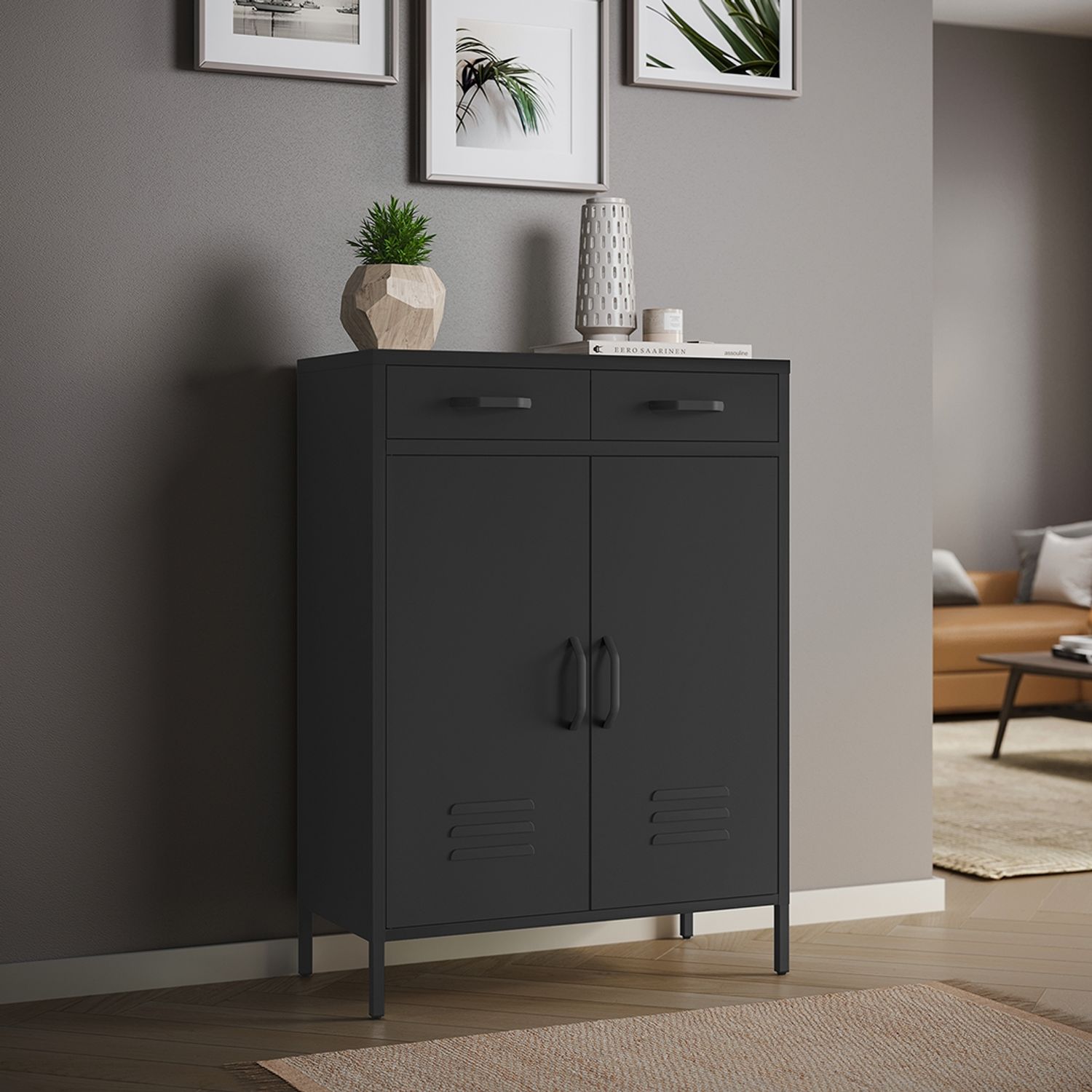 **Praktischer Stauraum mit modernem Look** Die Metallkommode „Atria“ von skølm bietet eine stilvolle Möglichkeit, um in Ihrem Zuhause für Ordnung zu sorgen. Durch die Kombination aus Doppeltüren, Schubladen und verstellbarem Einlegeboden ist sie besonders vielseitig einsetzbar – ob als Sideboard, TV-Schrank oder Aufbewahrungslösung im Schlafzimmer, Flur oder Büro. **Robust und langlebig aus Stahl** Gefertigt aus hochwertigem, pulverbeschichtetem Stahl überzeugt „Atria“ durch Stabilität und eine pflegeleichte, feuchtigkeitsbeständige Oberfläche. Die widerstandsfähige Konstruktion ist ideal für den täglichen Gebrauch und kann sogar auf dem Balkon oder in der Küche verwendet werden. **Flexible Innenaufteilung mit Einlegeboden** Ein höhenverstellbarer Einlegeboden ermöglicht die individuelle Anpassung des Innenraums – ideal für größere oder kleinere Gegenstände. So lässt sich der Stauraum gezielt strukturieren und effizient nutzen. **Zusätzlicher Platz durch Schubladen** Zwei integrierte Schubladen bieten zusätzlichen Stauraum für kleinere Utensilien und sorgen dafür, dass Alltagsgegenstände schnell griffbereit, aber dennoch ordentlich verstaut sind. Jede Schublade ist mit bis zu 10 kg belastbar. **Sicherer Stand und einfache Handhabung** Höhenverstellbare Füße sorgen für Stabilität – auch auf unebenen Böden. Die Türen lassen sich durch integrierte Magnetverschlüsse zuverlässig schließen. Die durchdachte Bauweise ermöglicht eine einfache und schnelle Selbstmontage. **Produktdetails:** - Produktmaße: H 110 cm x T 38 cm x B 80 cm - Material: Stahl, pulverbeschichtet (Stahl-Epoxid-Beschichtung) - Belastbarkeit: 20 kg pro Ablage, 10 kg pro Schublade, 80 kg gesamt - Ausstattung: 1 höhenverstellbarer Einlegeboden, 2 Schubladen - Funktion: Höhenverstellbare Füße, Magnetverschlüsse an Türen - Montage: Schnelle und einfache Selbstmontage