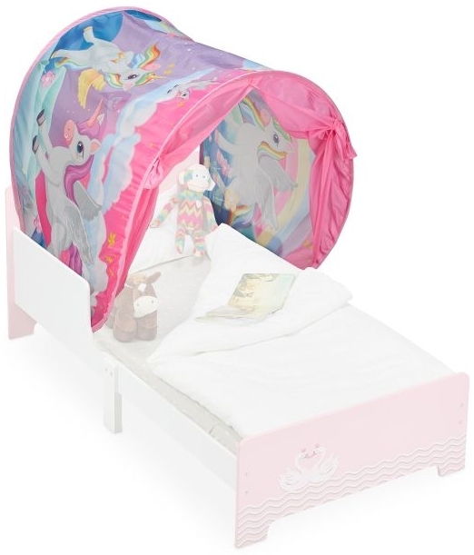 Das Bettzelt für Kinder bietet eine gemütliche und geschützte Umgebung, die die Vorstellungskraft anregt und für zusätzlichen Spaß im Kinderzimmer sorgt. Mit einem bunten Design, das sowohl für Mädchen als auch Jungen geeignet ist, lädt es zum Spielen, Träumen und Entspannen ein. Der Bettbogen wird einfach unter die Matratze des Kinderbetts geklemmt und ist dank der Pop-up-Funktion schnell einsatzbereit. **Highlights** - Regt die kindliche Vorstellungskraft an - Farbenfrohe Designs für Mädchen und Jungen - Mit Vorhängen und Innentasche für kleine Schätze - Einfaches Anbringen durch Einklemmen unter Matratze - Schnell einsatzbereit dank Pop-up-Funktion **Produkteigenschaften** - Maße B x T: ca. 220 x 79 cm - Bogenhöhe: variabel - Mattratzenklemmer D: ca. 36 cm - Innentasche H x B: ca. 20 x 18 cm - Gewicht: ca. 310 g - Material: Polyester - Farbe: Bunt **Lieferumfang** - 1x Bettbogen in gewähltem Design - Dekoartikel sind nicht im Lieferumfang enthalten
