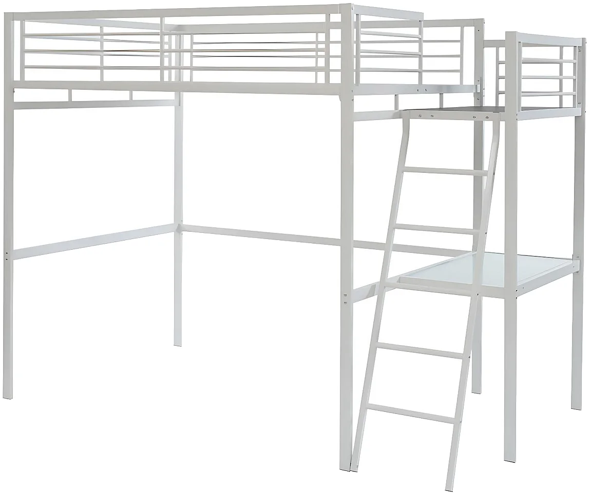 Das Hochbett CASUAL II vereint Funktionalität und modernes Design. Mit einer Liegefläche von 140 x 190 cm bietet es Platz für zwei Personen. Der integrierte Schreibtisch im unteren Bereich sorgt für einen produktiven Arbeitsbereich, während ausreichend Raum für ein Sofa gesorgt ist. Hergestellt aus robustem Stahl, garantiert es Langlebigkeit und Stabilität. Ideal für kleine Räume, wird dieses Hochbett Ihr Schlafzimmer aufwerten. **Highlights** - Integrierter Schreibtisch für produktives Arbeiten - Maximale Traglast von 200 kg - Robustes Material aus Stahl für Langlebigkeit - Platzsparendes Design für kleine Räume - Leiter kann links oder rechts montiert werden **Produkteigenschaften** - Farbe: Weiß - Material: Stahl - Größe (Liegefläche): 140 x 190 cm - Anzahl Personen: 2 Personen - Ohne Matratze - Mit Lattenrost (Metall) und 26 Latten - Höhe unter dem Bett: 158 cm - Schreibtischplatte: 90 x 51 cm - Oberfläche: Matt - An der Wand zu befestigen - Nicht für Kinder unter 6 Jahren geeignet **Lieferumfang** - Hochbett CASUAL II - Lattenrost - Schreibtisch - Montageanleitung - Ohne Matratze