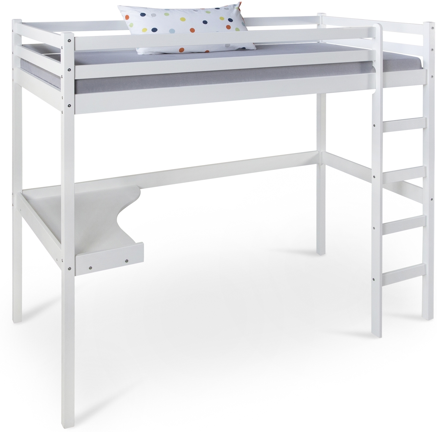Schlafen, Spielen und Lernen. Mit diesem multifunktionalen, weißen Hochbett schaffen Sie ein Spiel-und Schlafparadies im Kinder- oder Jugendzimmer. Ein Hochbett ist Teil von kleinen Abenteuern und Fantasiespielen und bietet durch seine Konstruktion viel Platz und Stauraum im Zimmer. Mit einer Liegefläche von 90x200 cm besteht unter dem stabilen Bett mit einer Höhe von 138,5 cm viel Platz für eine Spiel- oder Schreibecke. Nach einem aufregenden Tag kann Ihr Kind in diesem Hochbett erholt und ruhig schlafen. Produktdetails: • Bettgestell (ohne Lattenrost, ohne Matratze) • Schreibtisch (lediglich links montierbar) • Leiter mit 4 flachen massiven Trittstufen (lediglich rechts montierbar) • stabile Ausführung durch massive Bettfüße • abgerundete Kanten und Pfosten • Sicherheitsumrandung (Absturzsicherung) • weiße Schreibtischrückwand kann optional montiert werden (zusätzliche Schrauben erforderlich) Material & Farbe: • aus Kiefernholz gefertigt • Tisch aus MDF gefertigt • weiß lackiert Maße: • Liegefläche: 90x200 cm • Länge: 206 cm • Breite: 96 cm • Gesamthöhe: 175cm • Spielhöhe unter dem Bett: 138,5 cm • Abmessungen Tisch usw. siehe Detailzeichnung • Einlegetiefe Matratze: 6 cm • Pfostenstärke: 50 mm Lieferdetails: • Bettgestell mit Schreibtisch und Leiter • Lattenrost, Matratze, Dekoration sind nicht im Lieferumfang enthalten • Verpackung durch kompakten und flachen Karton • Bett wird zerlegt geliefert • einfache Montage für 1-2 Personen • Aufbauanleitung und Beschläge zur Montage befinden sich verpackt im Inneren des Kartons