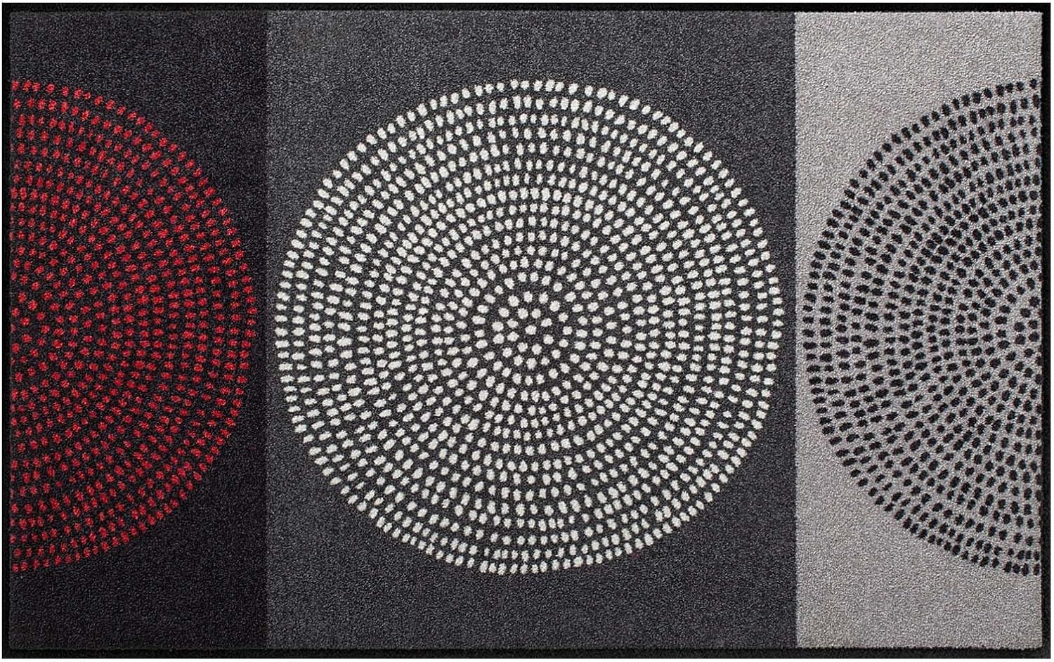 | Beschreibung | Die Salonloewe Läufer Fußmatte Nestor in Rot ist eine moderne und funktionale Eingangsmatte mit den Maßen 75 x 120 cm. Hergestellt aus 100 % Polyamid, bietet sie eine pflegeleichte, strapazierfähige und rutschfeste Oberfläche. Die Matte ist trittschalldämmend, für Fußbodenheizung geeignet und besonders staub- sowie schmutzbindend. Sie kann sowohl innen als auch außen verwendet werden und ist ideal für Allergiker. **Highlights** - Waschbare Fußmatte bis 60 Grad - Rutschfest und trittschalldämmend - Geeignet für Fußbodenheizung - Besonders staub- und schmutzbindend - In Deutschland produziert von Efia **Produkteigenschaften** - Maße: 75 x 120 cm - Material: 100 % Polyamid/Kräuselvelours, emcoFlex Gummi, PVC-frei - Pflegeleicht: alle zwei bis drei Monate waschen - Vielseitig einsetzbar als Schmutzfangmatte, Fußabtreter oder Türvorleger |