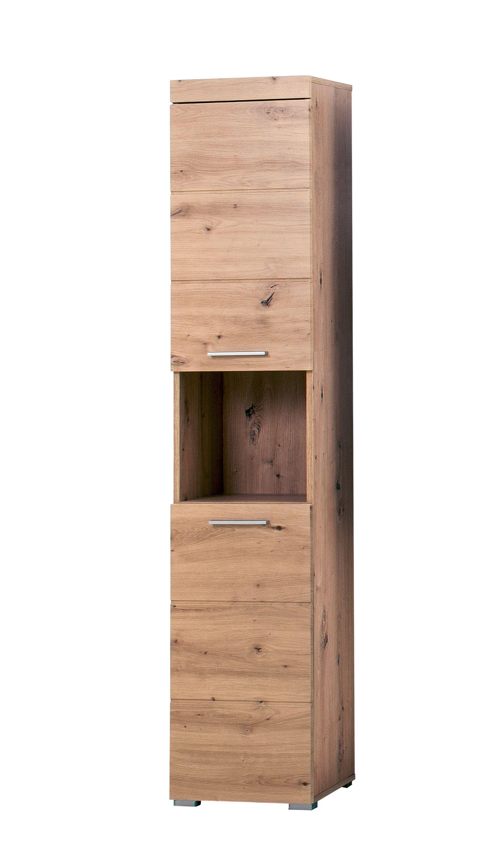 **Details:** Hochschrank Amanda Fronten Asteiche Melamin tiefgezogen Korpus und Absetzungen Asteiche Melamin B/H/T ca. : 37/190/31 cm 2 Türen Türen links oder rechts zu befestigen 2 Einlegeböden / 4 geschlossene Fächer Einlegeböden höhenverstellbar 1 offenes Fach **Qualität:** Fronten Asteiche Melamin tiefgezogen, dadurch keine Umleimerkanten und besserer Schutz gegen Feuchtigkeit Korpus und Absetzungen Asteiche, strapazierfähige Melaminbeschichtung, keine Folie Türen links oder rechts öffnend Einlegeböden höhenverstellbar Griffleisten in Aluoptik Metallscharniere Pflegeleicht, einfach feucht abzuwischen viel Stauraum bei wenig Platzbedarf min. 70% FSC®-zertifizierter Holzwerkstoff, aus nachhaltiger Forstwirtschaft **Lieferumfang:** Zerlegt/Selbstmontage, inkl. bebilderte Aufbauanleitung Montage- und Befestigungsmaterial Dekoration, Beimöbel und Elektrogeräte sind nicht enthalten