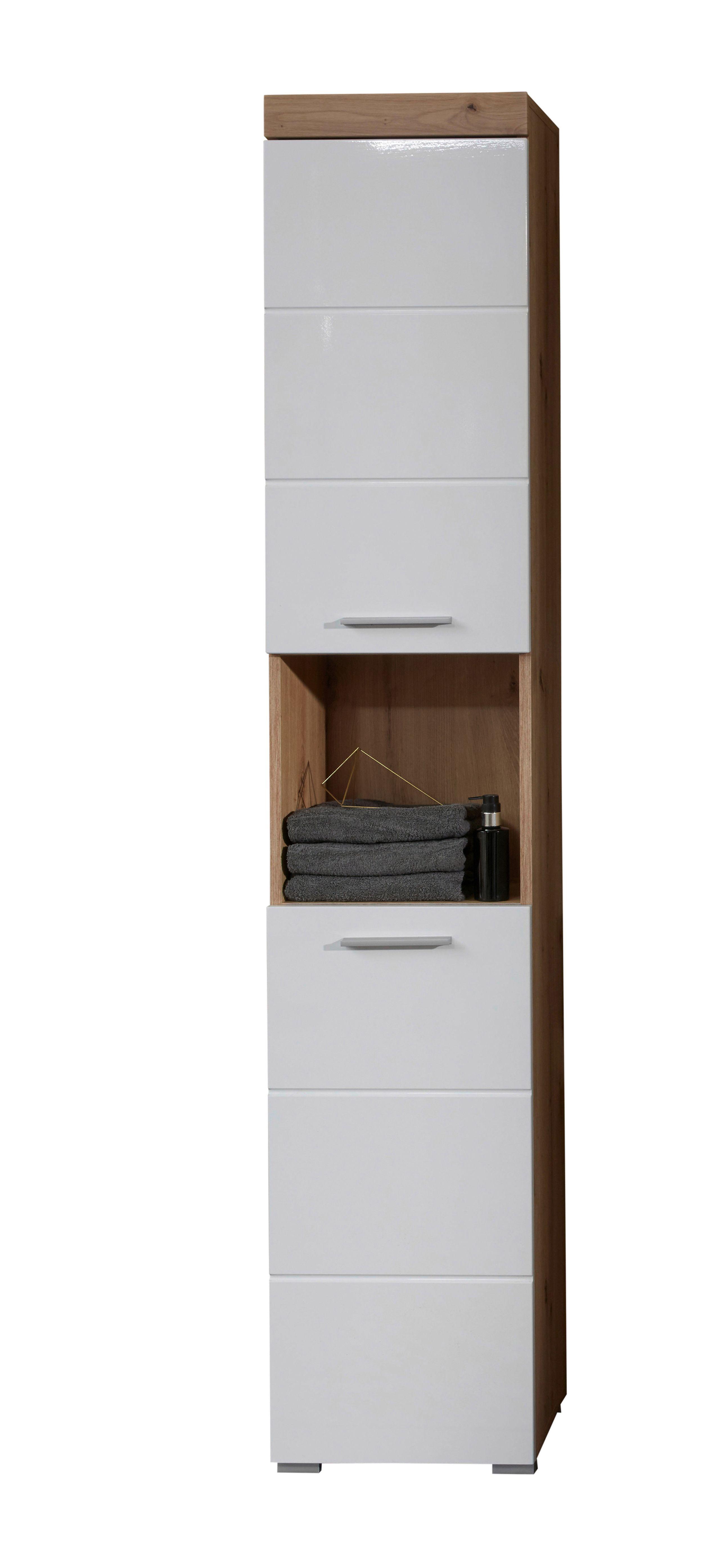 Der Hochschrank Badmöbel Amanda vereint modernes Design mit praktischer Funktionalität. Mit einer Höhe von 190 cm, einer Breite von 37 cm und einer Tiefe von 31 cm bietet er viel Stauraum auf kleinem Raum. Die Fronten in Hochglanz weiß und der Korpus in Asteiche sorgen für eine ansprechende Optik. Die höhenverstellbaren Einlegeböden und die Möglichkeit, die Türen links oder rechts zu montieren, machen ihn besonders flexibel. **Highlights** - Fronten in Hochglanz weiß für eine elegante Optik - Korpus und Absetzungen aus strapazierfähiger Asteiche - Höhenverstellbare Einlegeböden für individuelle Anpassung - Pflegeleicht und feucht abwischbar - Viel Stauraum bei minimalem Platzbedarf **Produkteigenschaften** - Abmessungen: B/H/T ca. 37/190/31 cm - 2 Türen, die links oder rechts montiert werden können - 2 höhenverstellbare Einlegeböden und 4 geschlossene Fächer - 1 offenes Fach - Metallscharniere für hohe Stabilität - Griffleisten in Aluoptik **Lieferumfang** - Zerlegt/Selbstmontage - Inkl. bebilderte Aufbauanleitung - Montage- und Befestigungsmaterial - Dekoration, Beimöbel und Elektrogeräte sind nicht enthalten