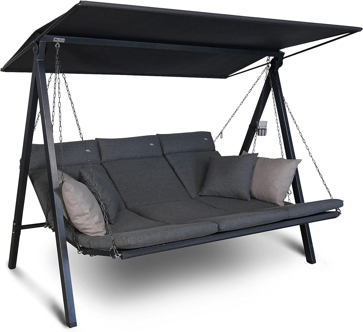 Die moderne 3-Sitzer Hollywoodschaukel Lounge ist ein echtes Designerstück und zählt zu den High-End Hollywoodschaukel Modellen der Firma Angerer. Die ergonomisch geformte Sitzfläche besteht aus robustem und dennoch leicht flexiblem Textilene Gewebe. Dank der Kettenaufhängung kann die Sitz- und Liegeposition individuell verstellt werden. Je nachdem, welche Position gewünscht ist, können die mitgelieferten Karabiner in jedes beliebige Kettenglied eingehängt werden. Neben der klassischen Sitzposition kann die Schaukelbank in eine Liegefläche oder in die U-förmige Lounge-Position umgewandelt werden. Der Clou: trotz abgeklappter Lehne lässt es sich noch bequem Schaukeln. Jede der drei Sitzauflagen hat ein extra dick gepolstertes Kopfteil, das mit einer schönen Logo-Stickung verziert ist. Alle Kissenbezüge sind aus einem besonders weichen Stoff gefertigt und lassen sich dank der praktischen Reißverschlüsse einfach abnehmen und bei 30° C in der Maschine waschen. Vier Sofakissen sind ebenfalls im Lieferumgang enthalten. Das robuste Gestell der Hollywoodschaukel besteht aus verzinktem und pulverbeschichtetem Stahl. Das Sonnendach ist, genau wie die Sitzbespannung, aus wetterfestem Textilene Gewebe gefertigt und ebenfalls verstellbar. Durch Vor- oder Zurückschieben oder Neigen des Daches ist stets optimaler Sonnenschutz gegeben. Zur Selbstmontage, inkl. Montageanleitung. Made in Germany.