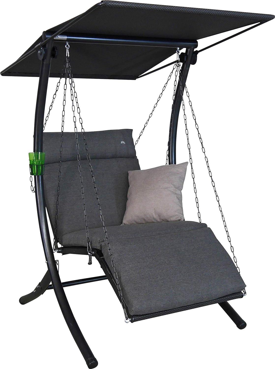 Die Hollywoodschaukel 1-Sitzer Swing Smart stone von Angerer ist ideal für Balkon, Terrasse oder kleine Gärten. Die Sitzbespannung aus Primetex Gewebe passt sich der Körperkontur an und sorgt für hohen Komfort. Das verzinkte Stahlgestell mit kratzunempfindlicher Pulverbeschichtung garantiert Langlebigkeit. Die Lehne ist neigungsverstellbar und kann zu einer Liegefläche abgeklappt werden. Das wetterfeste Sonnendach bietet optimalen Sonnenschutz. Die Schaukel ist belastbar bis ca. 120 kg und hat eine Standfläche von ca. 100 x 145 cm. **Highlights** - Perfekt für Balkon, Terrasse oder kleinen Garten - Sitzbespannung aus Primetex Gewebe für optimalen Komfort - Verzinktes Stahlgestell mit kratzunempfindlicher Pulverbeschichtung - Einfacher Aufbau dank vormontierter Teile - Verstellbares Sonnendach für optimalen Sonnenschutz **Produkteigenschaften** - Bequemer, ergonomisch geformter Sitz und komfortables Fußteil - Bezüge aus weichem und hochwertigem Polyesterstoff - Neigungsverstellbares Sonnendach aus wetterfestem Primetex Gewebe - Lehne neigungsverstellbar und zu Liegefläche abklappbar - Belastbarkeit: ca. 120 kg - Standfläche: ca. 100 x 145 cm - Höhe: ca. 160 cm - Zur Selbstmontage, inklusive Montageanleitung - Made in Germany **Lieferumfang** - Hollywoodschaukel 1-Sitzer Swing Smart stone - Sitzauflage - Sofakissen - Montageanleitung